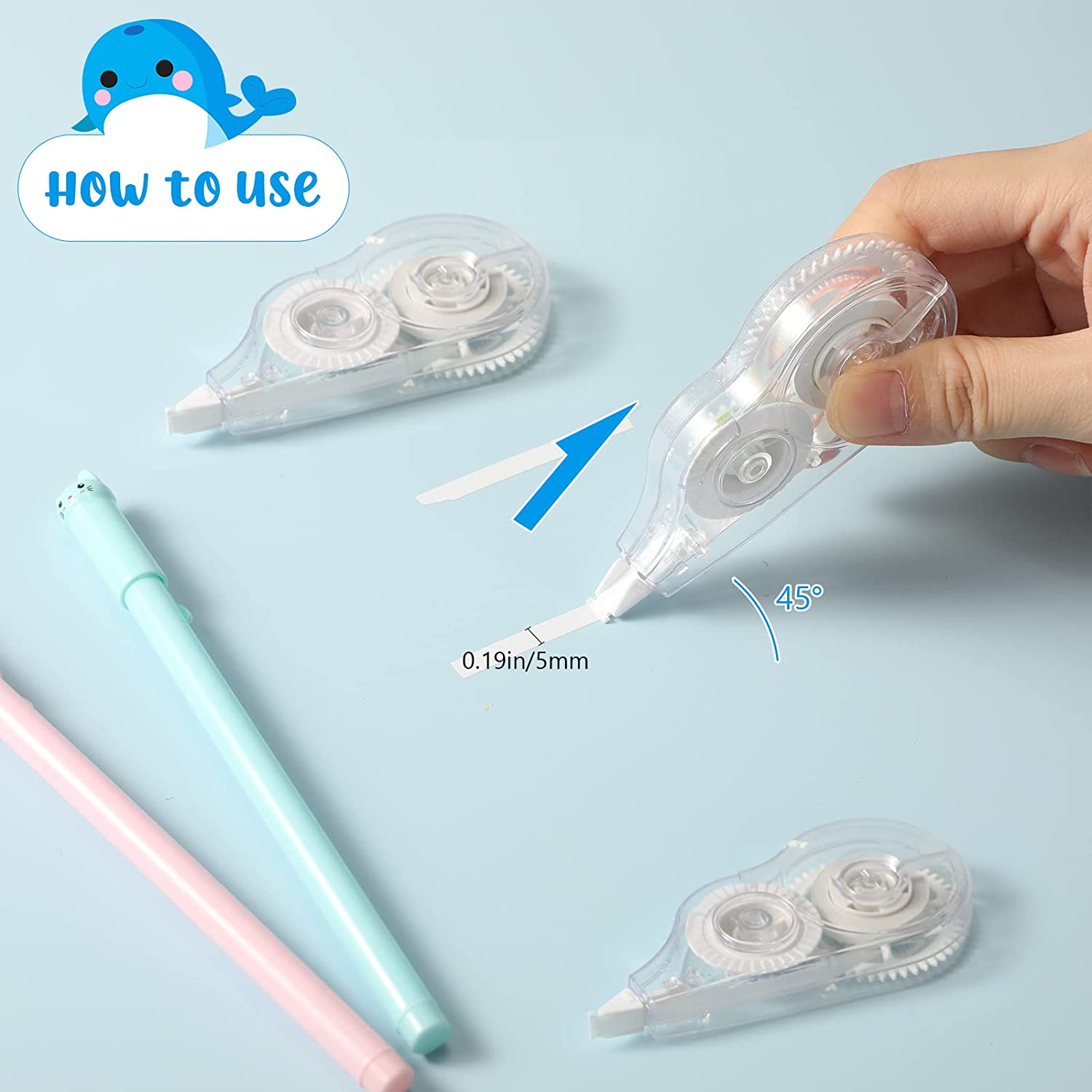 • Easy to Use: please ensure that the surface to be modified is smooth and flat before use; Fix the head of the plastic correction tape in the wrong position, then slide it back at a 45 degree; The tape slides gently and prints onto the paper, then straightens at a 90 degree