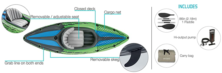 • Cargo net to store extra gear, and grab line on both ends of kayak; inflatable seat with backrest