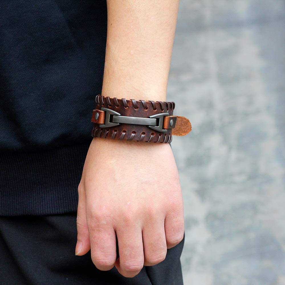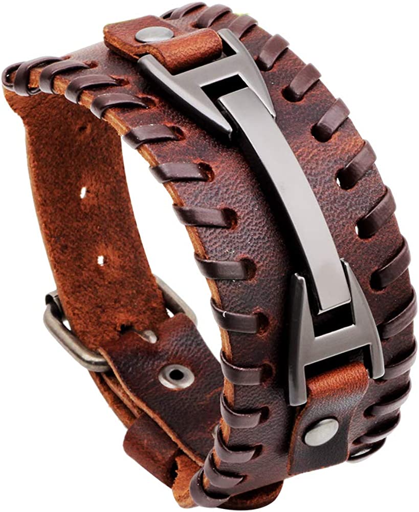 SUITABLE SIZE AND PERFECT DESIGN - This leather bracelet is 11.5*1.6 inches. This leather bracelet is a perfect combination of metalwork and leather. The metalwork is a shape of letter H, which is Gothic jewelry style