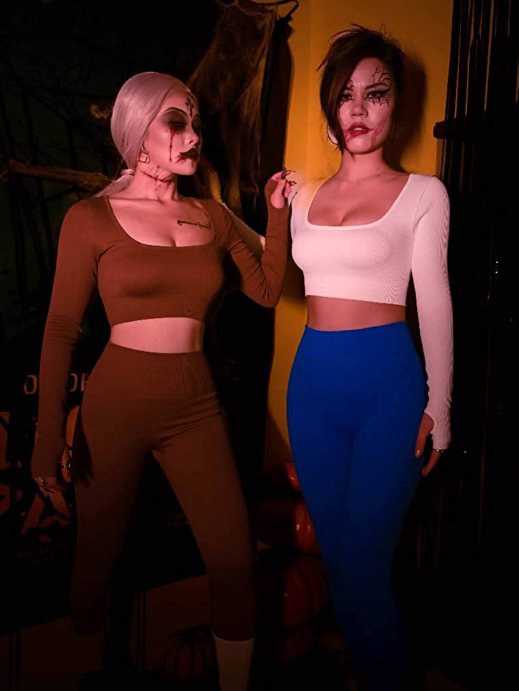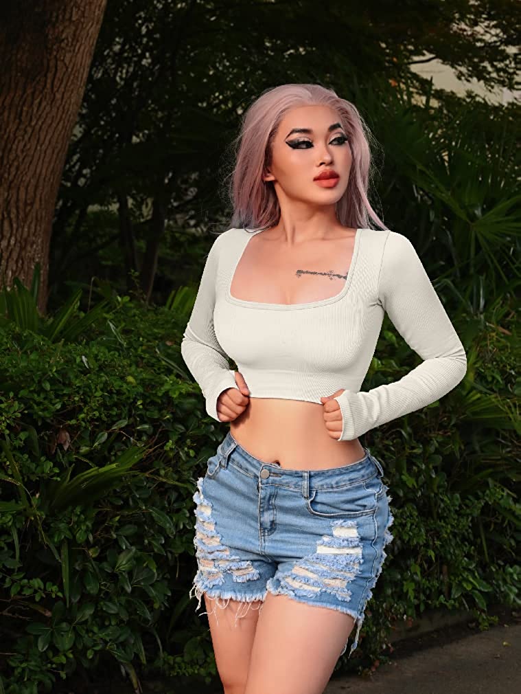Sexy Ribbed Long Sleeve Square Neckline Crop Tops:Cut with a flattering square neckline,long sleeve with thumb hole,simple in design,non-padded.