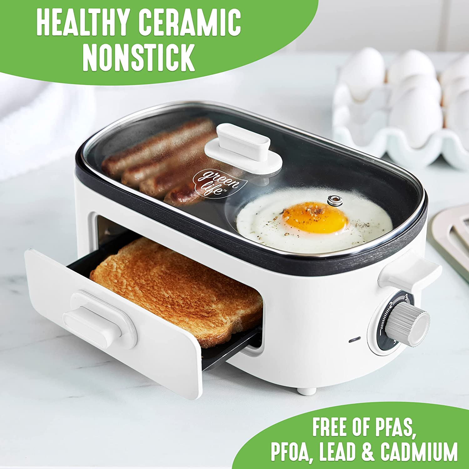 GreenLife 3-in-1 Breakfast Maker Station, Healthy Ceramic Nonstick Dual Griddles for Eggs Meat and Pancakes, 2 Slice Toast Drawer, Easy-to-use Timer, Turquoise
