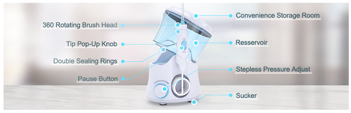 - 【7 Household Multifunctional Nozzles】The household oral irrigator has 7 heads, including 3 classic nozzles, 1 tongue cleaner, 1 dental plaque head, 1 orthodontic head, and 1 periodontal head. These multi-function nozzles can help you clean the hard-to-reach areas of the toothbrush. The nozzle can be stored in the sealing groove cover hygienically and conveniently