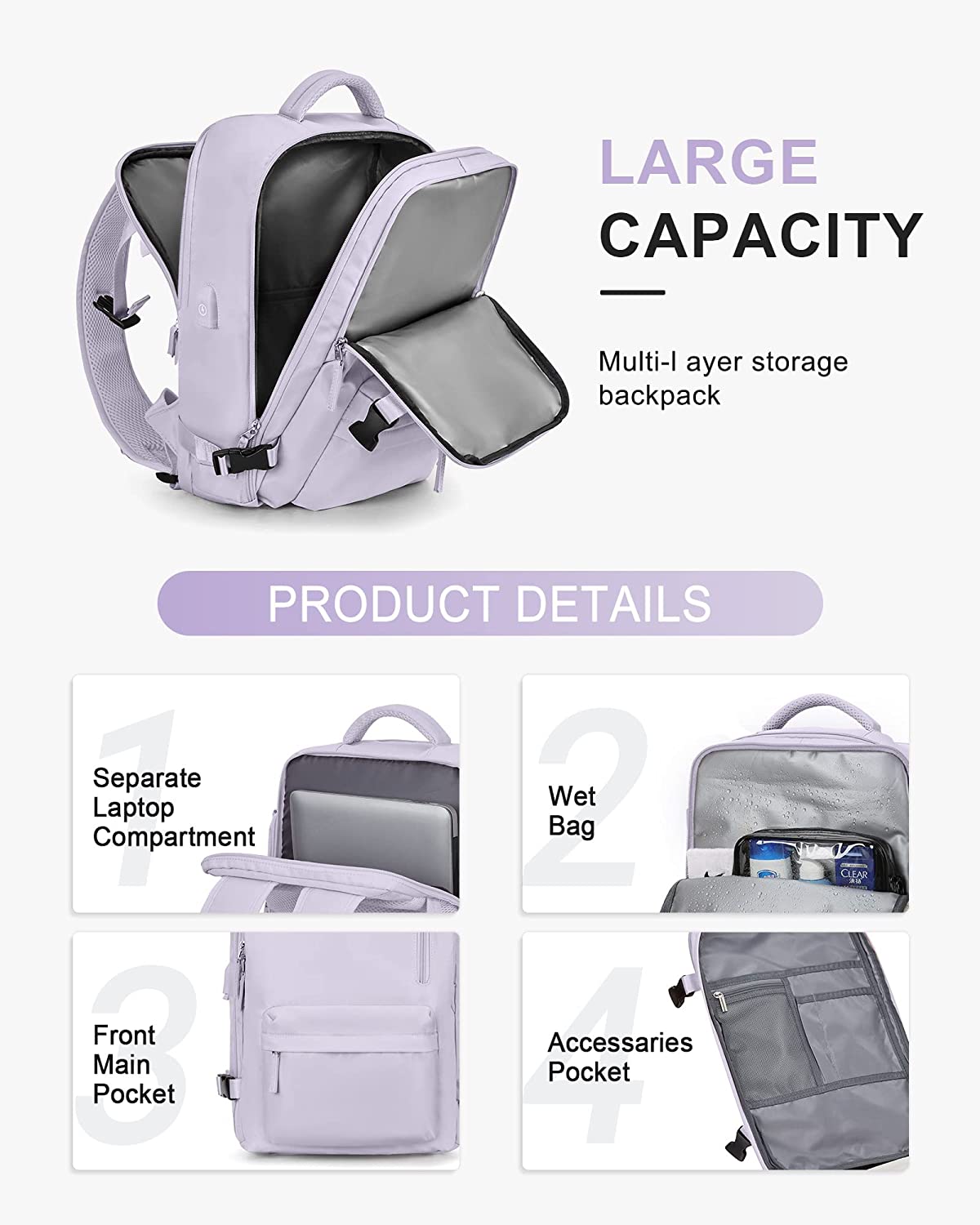 • Large Capacity Travel Backpack: Two main pockets for women's personal items,clothes and more; keep your items organized and easier to find. Two laptop compartments for a 13-inch ipad and a 15.6-inch laptop.the casual backpack is also designed with a waterproof wet bag and a separate shoe compartment, the wet bag is made of high-density waterproof material to help you separate wet and dry items, and the separate shoe compartment can help you better carry your shoes