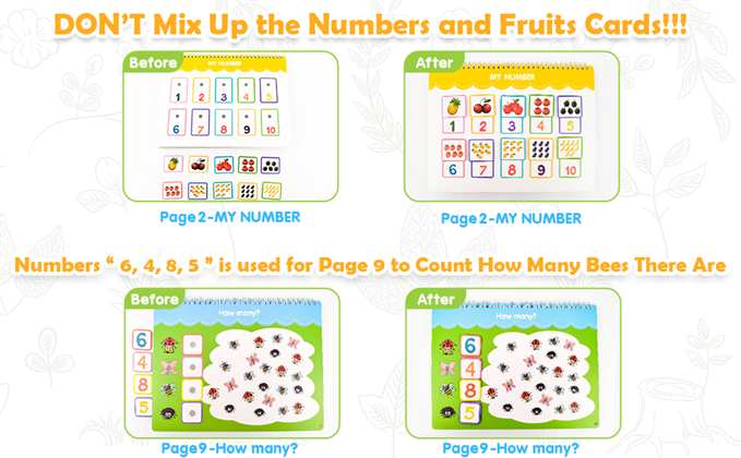 - 1. DON’T Mix Up to Use the Numbers and Fruits Cards In The Same Pages !!!