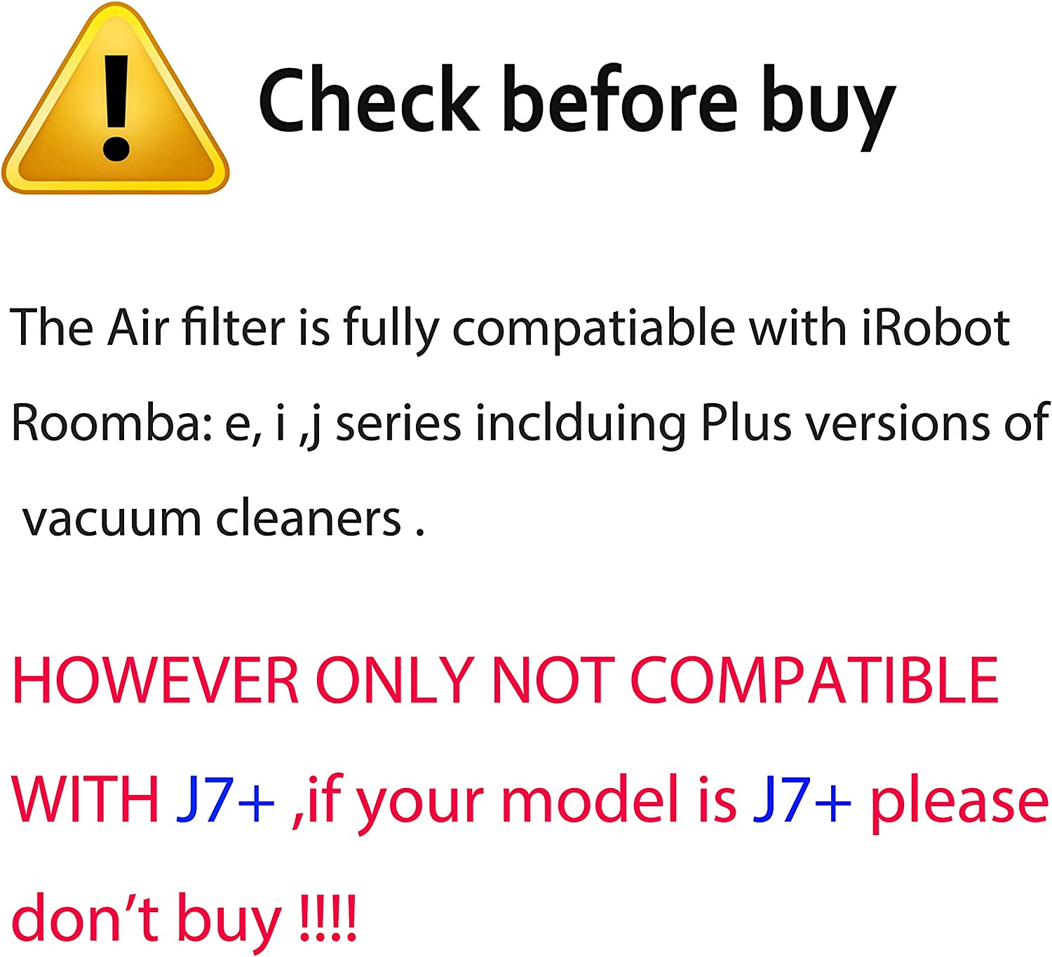 • The High-Effiiciency Filters are Compatible with iRobot Roomba E series E5 (E5134) E6 (E6198) E7 I series i7(7150) i7+ i7 plus(7550) i1+(1552) i4+(4550 4552)i3+(3550) i6+(6550) i8+(8550) i2(2510) NOT FOR J7+ !!!