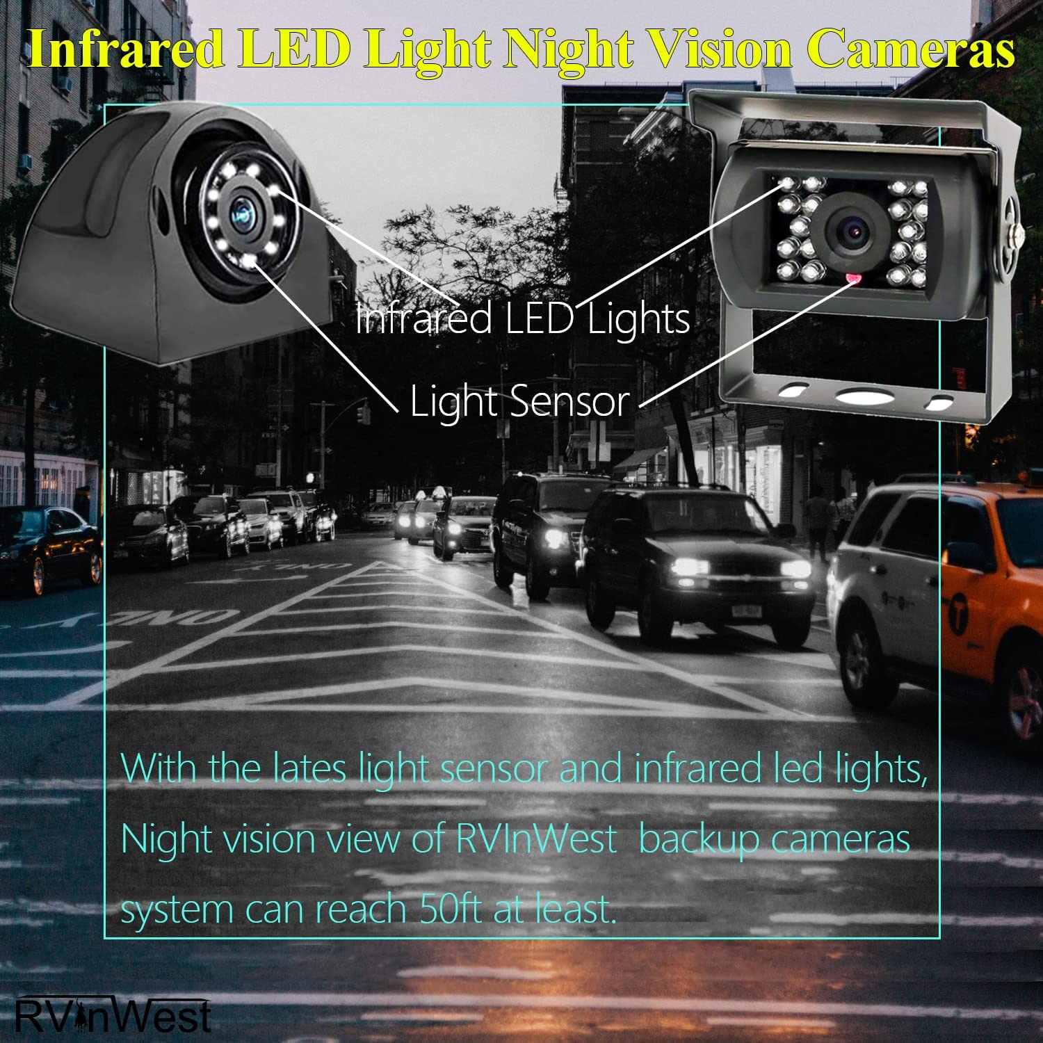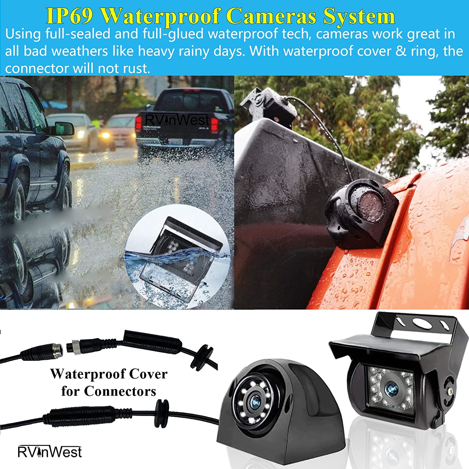 • 【IP69 Waterproof Cameras】Using full-sealed and glue-glued tech, RVInWest side view/front view/rear view camera can work great on all bad weathers. With additional waterproof covers protecting the connections, you do not need to worry about rust.