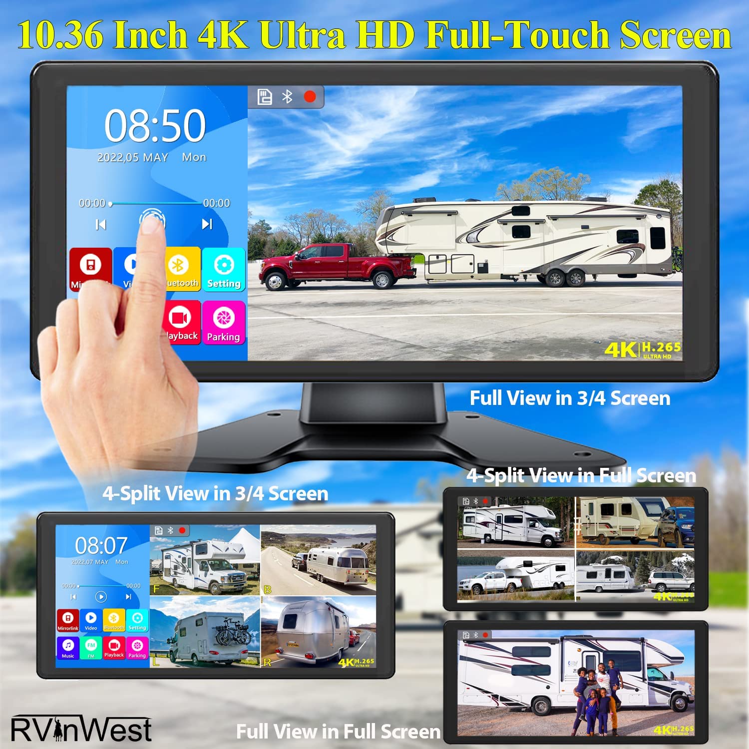 4K RV Camera System, Touch Screen 10.36 Inch DVR Quad 4 Split Screen Monitor with Bluetooth MP3 MP4 + IP69 Waterproof Night Vision 1080P Backup Rear Side View Wired Camera for RV Truck Trailer Camper