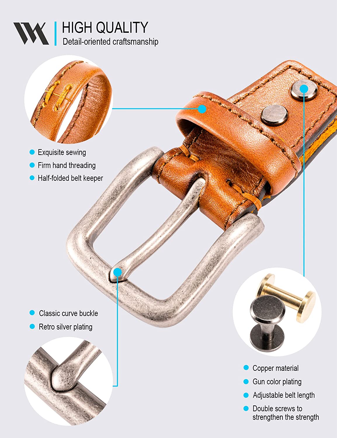 [Aesthetic Buckle]: Unlike flat buckles, the curve of heavy duty metal buckle makes it look more aesthetic. Combined with Exquisite handmade, this cowhide belt will serve as a fine accessory to any jeans,casual,work pants& more.