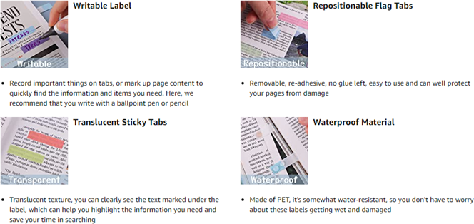 • Safety & Premium PET Material: waterproof and no odor, easy to write and mark, our sticky index tabs are easy to stick and remove without damaging the surface and leaving glue, if accidentally wet with water, it can be easily wiped off with a paper towel without affecting writing