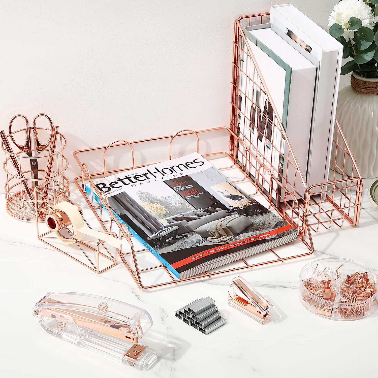 Rose Gold Desk Accessories Office Supplies Set, File Holder, Magazine File Organizer, Pen Holder, Stapler, Staple Remover, Staples, Tape Dispenser, Ballpoint Pen, Scissor, Binder Clips for Office
