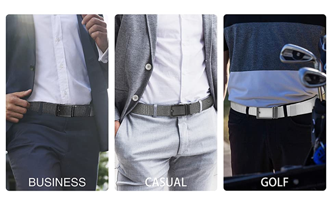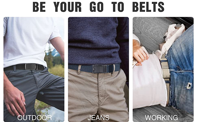 ✦【Easy to Use】Just slide the casual belt into the buckle and pull web belt through, the ratchet buckle simply automatic locks.To release the ratchet belt, gently push the lever on the side of the buckle and pull the webbing out. External sliding design make it easier and quicker.