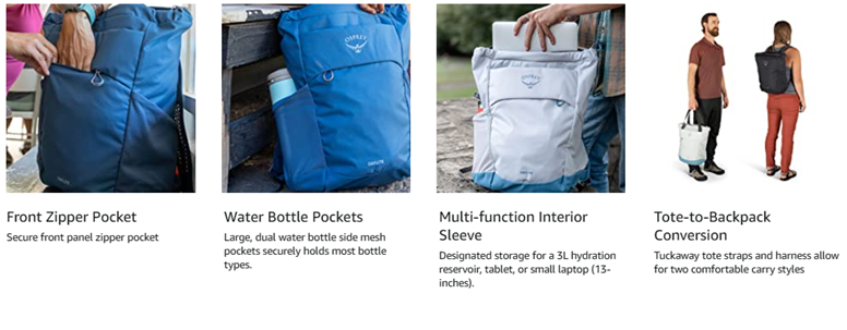 • Dual stretch mesh side pockets provide additional storage options and securely fit most water bottles