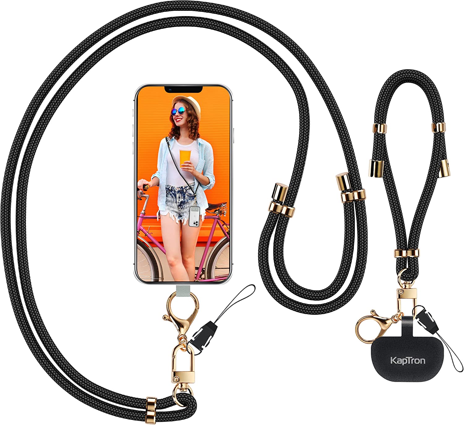 Universal Phone Lanyard with Wrist Strap, Adjustable Crossbody Cell Phone Lanyard Neck Strap and Wristlet Strap with 2 Lobster Clips, Phone Tether Patches and Phone Straps (Black/Gold, 2 Pack)