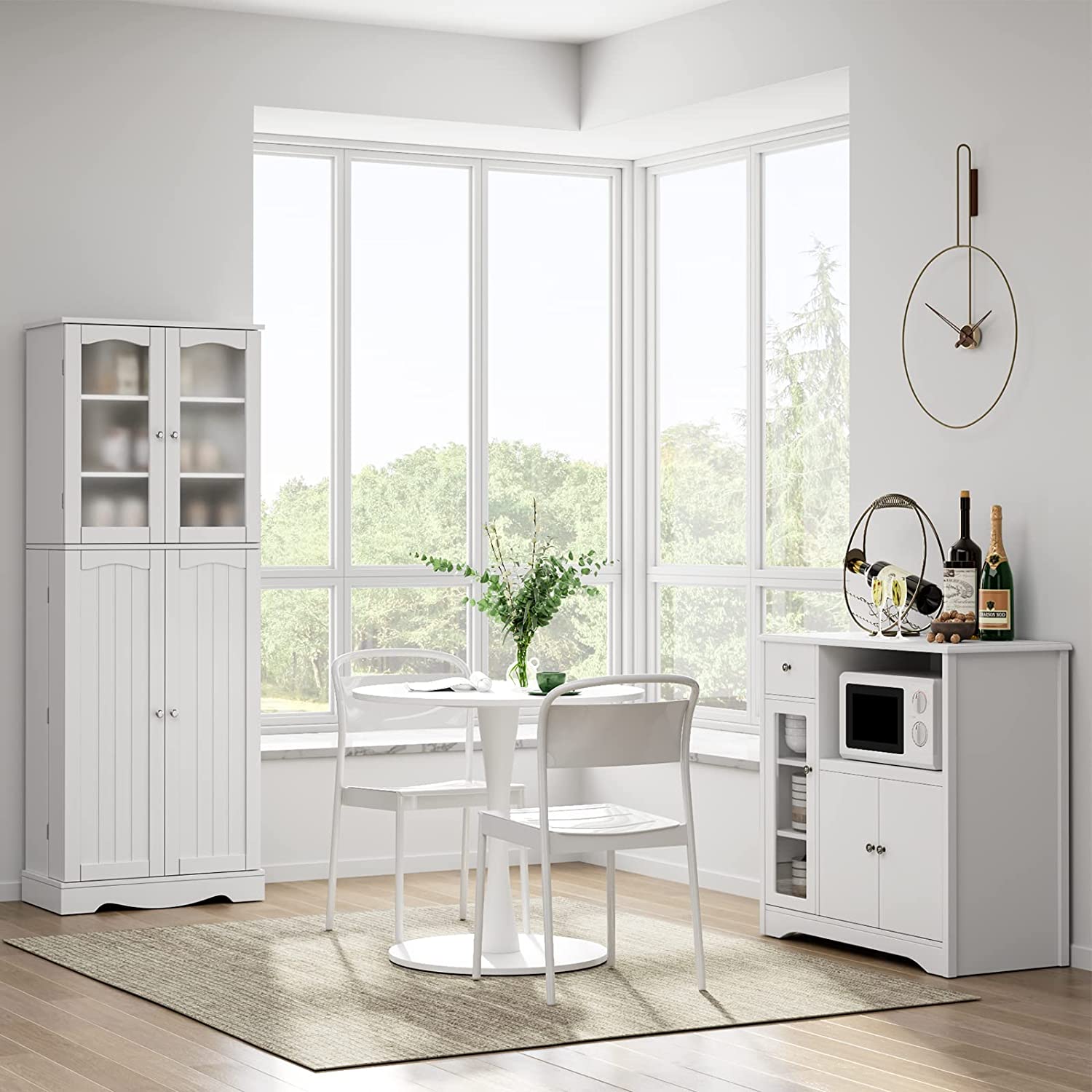 【Large Space Utilization】The pantry cabinet has 2 double door cabinets, you can see 10 sub-compartments when opened, and also 4 storage shelves behind the side door. Multi-layer shelves provide ample storage space for drinks, canned goods, dried pasta, oils, spices, and tableware. Now you can organize all your kitchen essentials neatly with this white food pantry