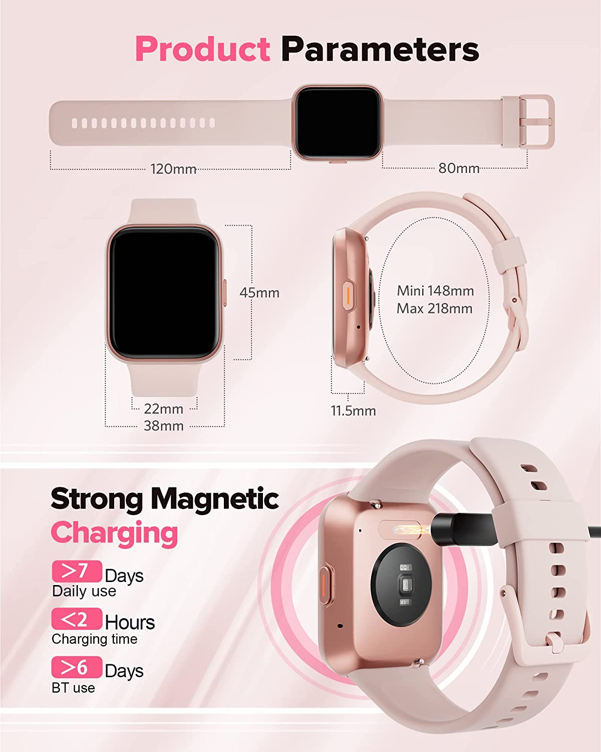 【Convenient Life Assistant】Smart watch for women has many useful features such as Women's Health, Pedometer, Weather Forecast, Noise Detection, Alarm Clock, Stopwatch, Music Control, Brightness Adjustment, etc, which can play an important role in daily life. Smart watches for women can be used for more than 7 days (within 2 hours) on one charge and on standby for over 25 days