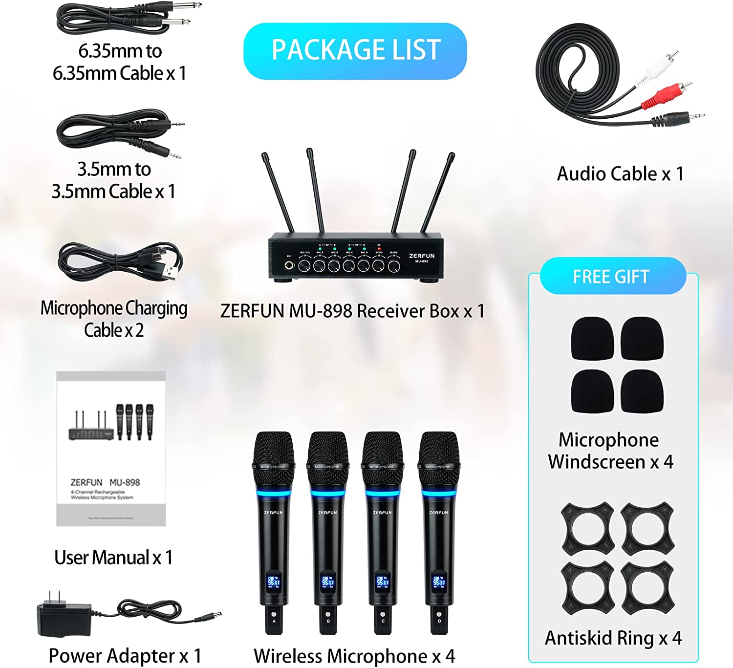 • PACKAGE LIST: ZERFUN Rechargeable Wireless Microphone x 4; Receiver Box x 1; Power Adapter x 1; 6.35mm to 6.35mm Cable x 1; 3.5mm to 3.5mm Cable x 1; Audio Cable x 1; Microphone Charging Cable x 2; Microphone Windscreen x 4; Antiskid Ring x 4; User Manual x