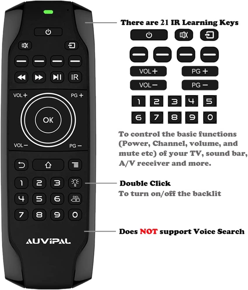All-in-one AuviPal G9F combines Bluetooth and Infrared wireless technology, which can control multiple devices just in one remote, Besides, It's equipped with backlit QWERTY keyboard on the back of the remote, No struggling with the on-screen keyboard, which makes it easier than ever to search or enter in website, user name and password etc even in the dark, no more pointing and clicking, Fully compatible with most popular APPs such as Hulu, Fidelity, Kodi, Netflix, Youtube, HBO and MORE!!!
