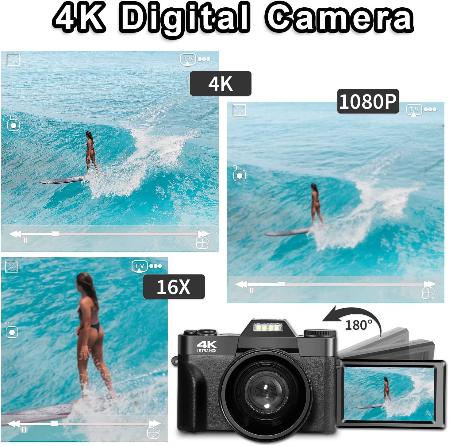 - ?【Camera for Photoggraphy and Video】The digital camera featuring 4K video and 48MP photo resolution, the vlogging camera supports 16X Digital Zoom, Video Pause, Recording while Charging, Loop Recording, Continuous Shooting, Silent Recording, Self-Timer. with the latest upgraded chip to ensure the camcorder images more high-definition, more realistic. It’s the best gift for friends and family.