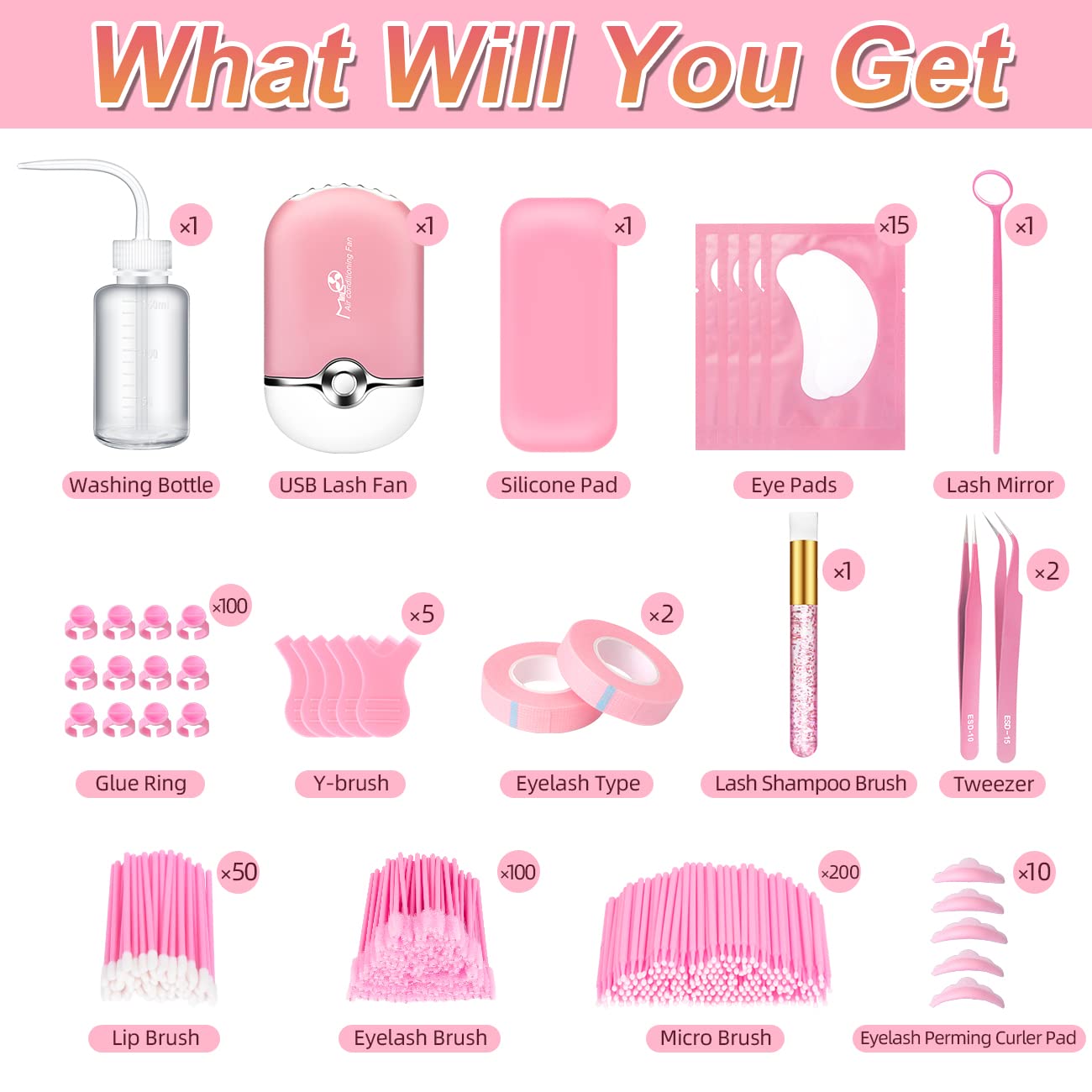 487PCS Eyelash Extension Kit Lash Extension Supplies for Beginners and Professionals, Lash Lift Eyelash Perm, Including Mini Fan Lash Dryer, Tweezers, Glue Rings, Mascara Brushes, Eye Gel Pads
