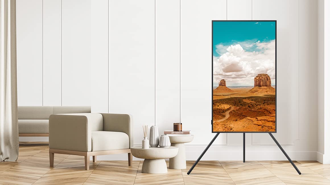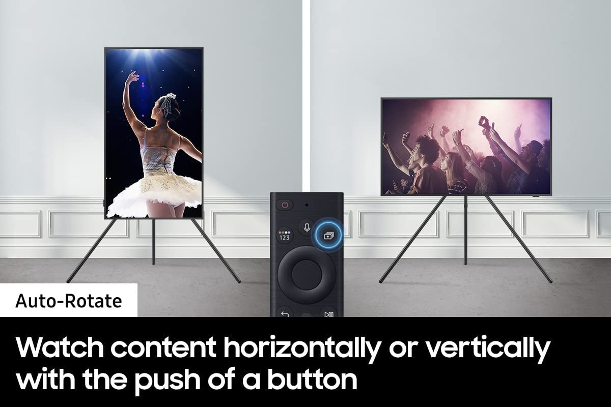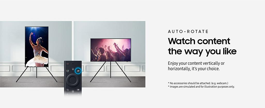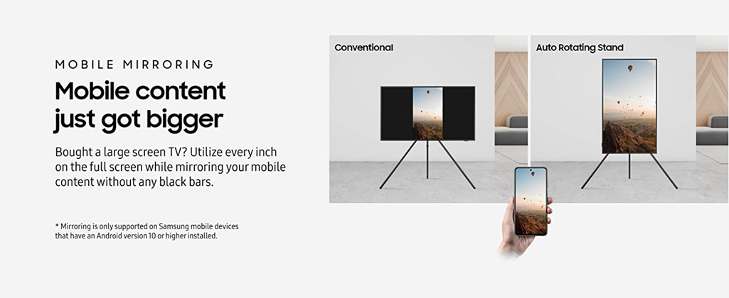 Enjoy vertical content vertically and horizontal content horizontally with the Auto Rotating Stand. Plus, you can mirror your mobile content to the big screen and enjoy a full TV experience.** *No accessories should be attached. (eg. webcam). Images are simulated and for illustration purposes only. **Mirroring is only supported on Samsung mobile devices that have an Android version 10 or higher installed.