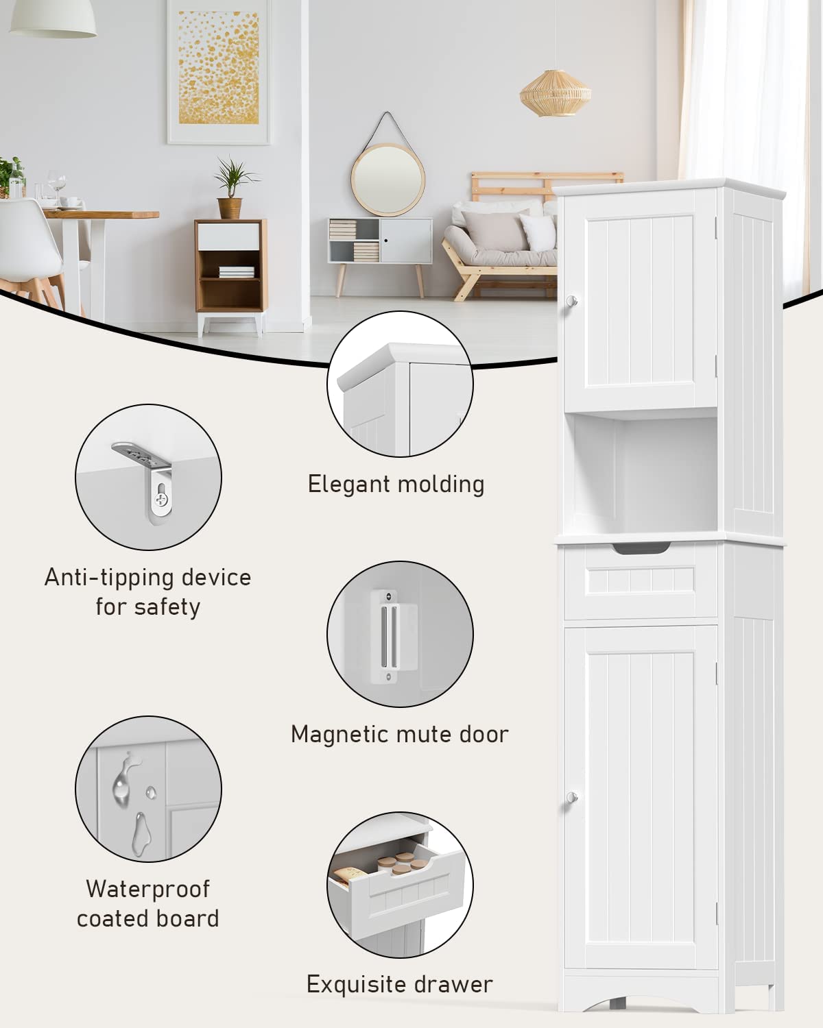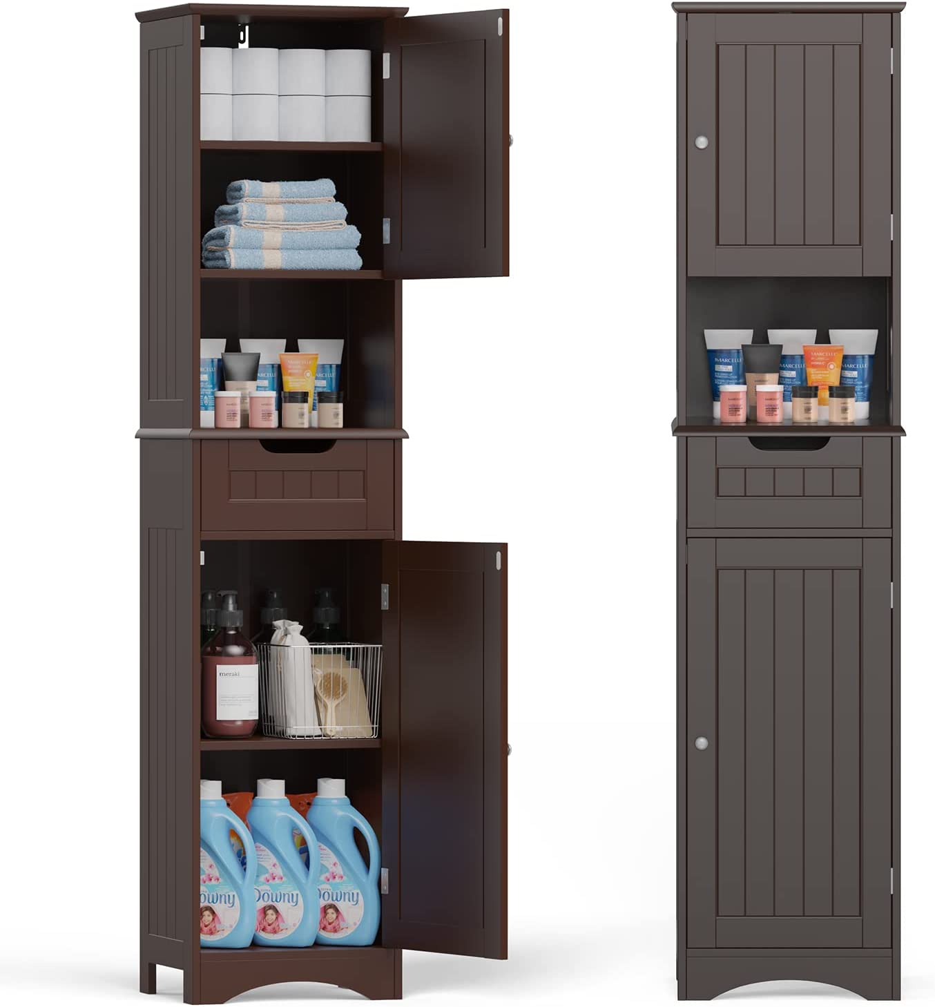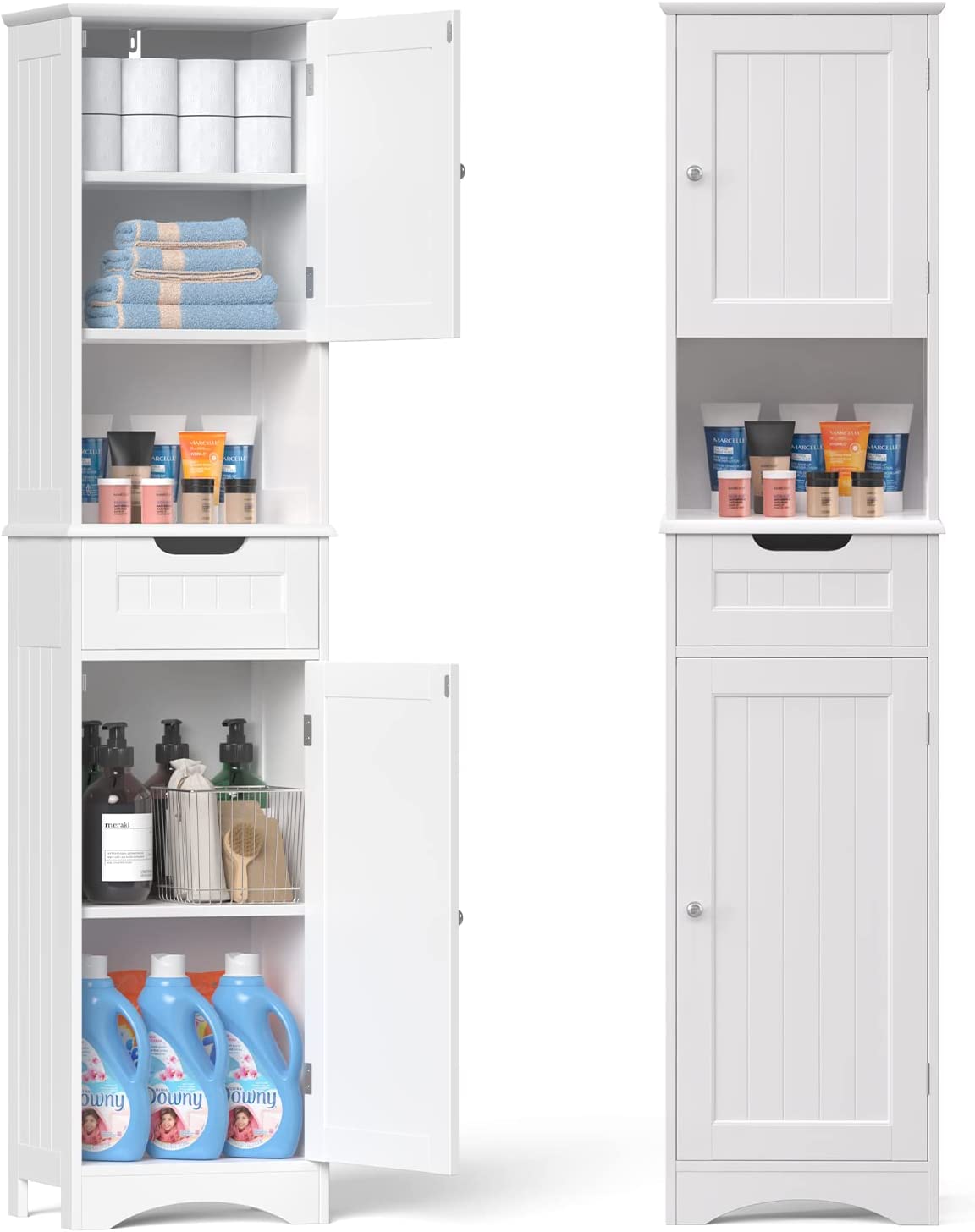 • Versatile Tall Linen Tower for Storage: This vertical freestanding cabinet is not only a bathroom cabinet for toiletries, but also a display shelf in the living room to place trophies, collections, a pantry in the kitchen to put spices and tableware, or a bookcase in the study or bedroom for books and clothes. Help you get a tidy and clean living space.