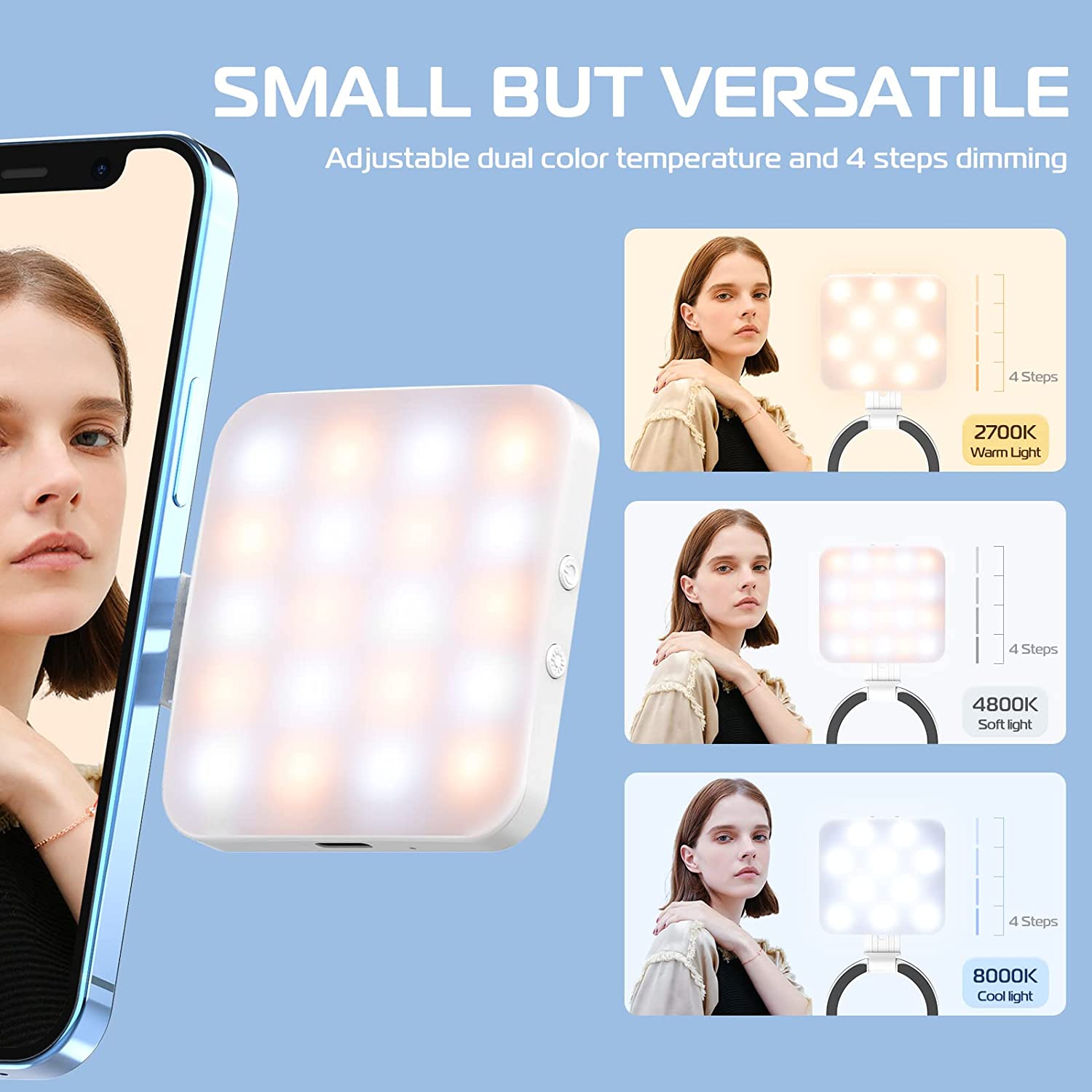 • ▶【Premium Light】 Adopting 20 pieces energy-saving LED beads (10 Yellow+10 White), this mini selfie light is adjustable in both brightness (1-4 steps) and 3 light modes of color temperature (2700k - 8000k). The illuminance range can reach 200LUX(0.3m). It ensures all your shots perfectly lit.
