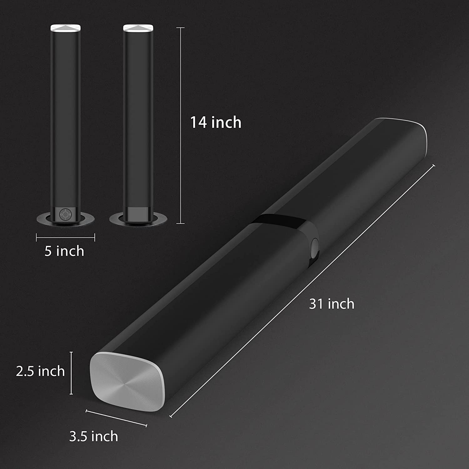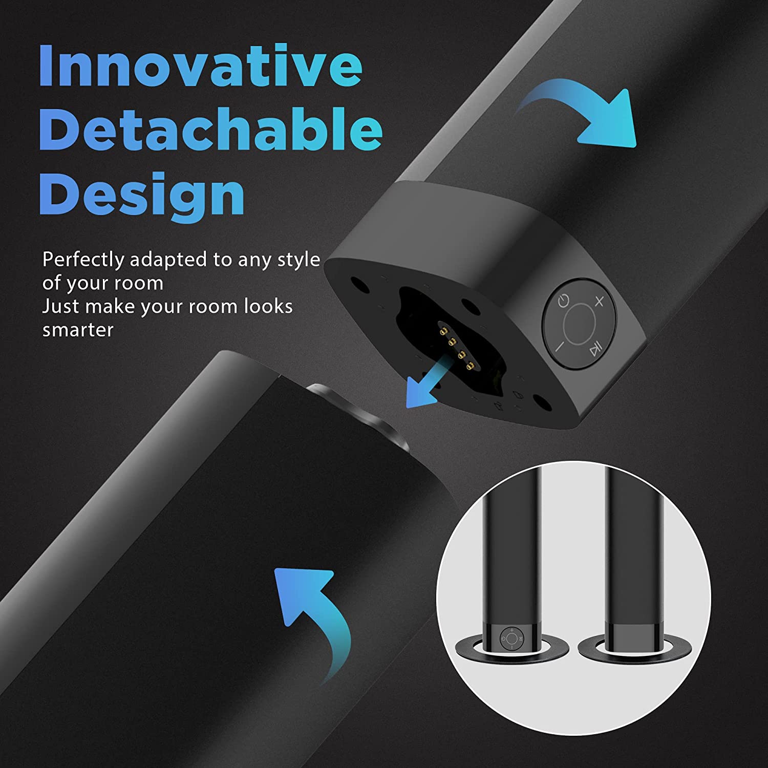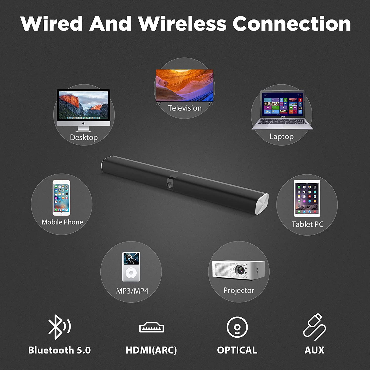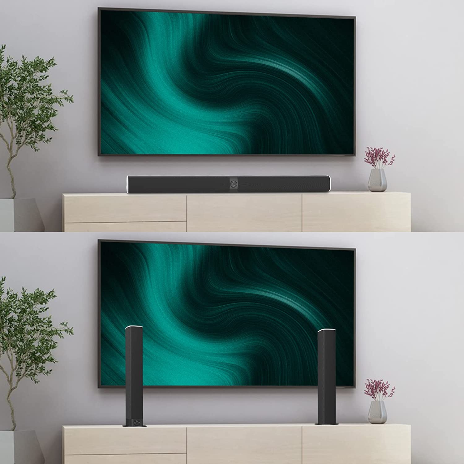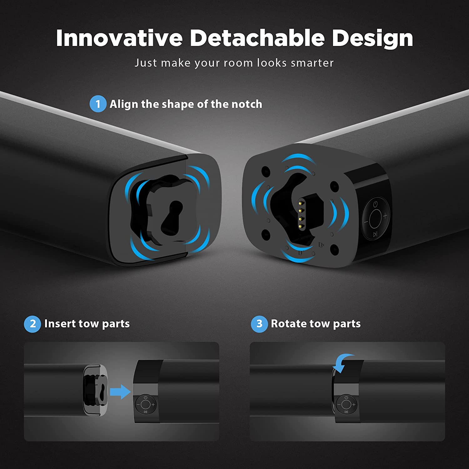• 【Multiple Wired Connections+ 2 in 1 Detachable Design】: Optical/HDMI/AUX connections for almost devices. Innovative Detachable Design - Splits into 2 stereo soundbars and attaches to a base, space saving, retro and elegant, a great addition to your room.