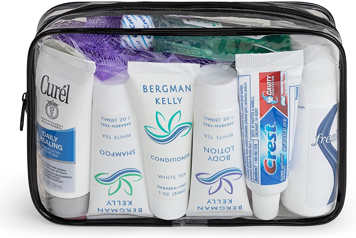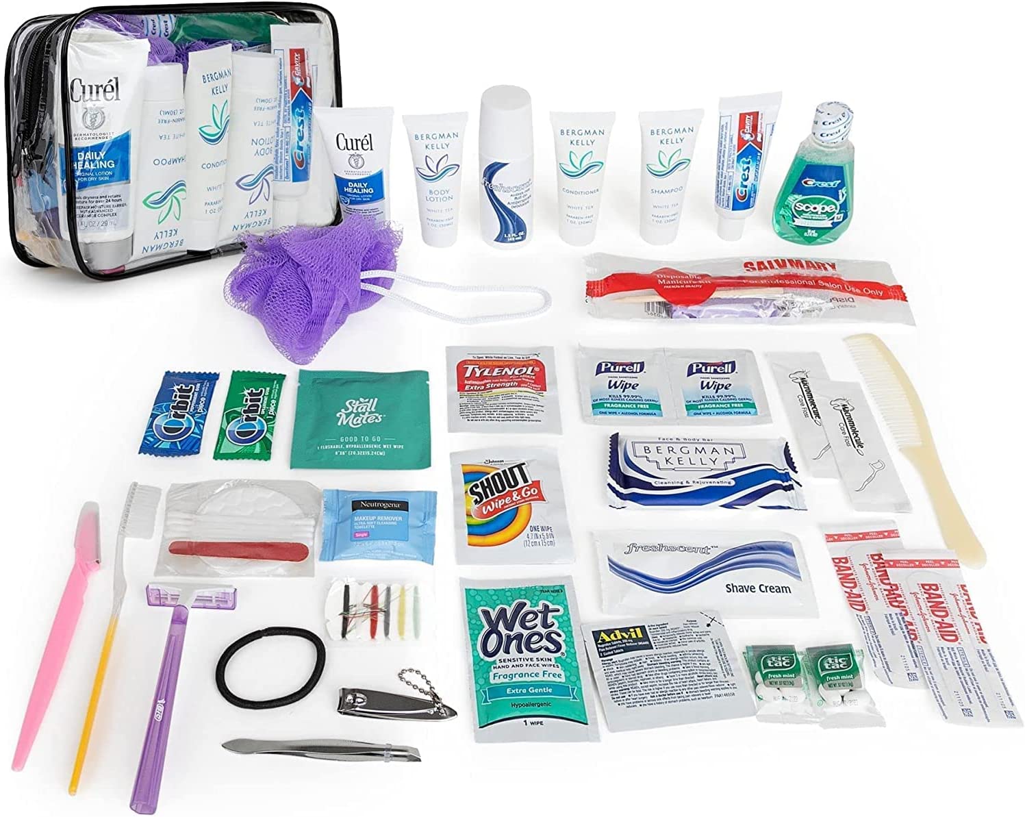 • TOILETRY TRAVEL ESSENTIALS INSIDE - Professional Disposable Manicure Kit, Sewing kit pack, Toothpaste, Tooth brush, Mouth wash, Shampoo, Lotion, Soap, Deodorant, Shower sponge, Hand wipe, Hand cream, Tylnol, Advl, Cotton Pads, Cotton Swabs, Nail File, Nail clipper, Tweezers, Comb, Body wipes, Makeup remover, Elastic hair tie, Shout, Shavers, Shaving cream, Mint, Gum, Dental floss, Bandages