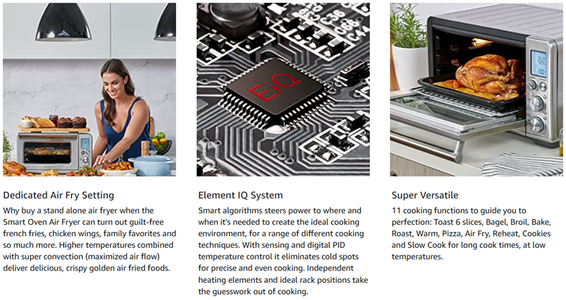 The Breville Smart Oven Air Fryer with 11 smart cooking functions including Air Fry The Smart Oven Air Fryer powered by our Element iQ system delivers maximum performance and versatility. Smart algorithms replicate the ideal cooking environment for air fry and 10 additional cooking techniques. Higher temperatures and super convection speeds up cooking time with great crispness.