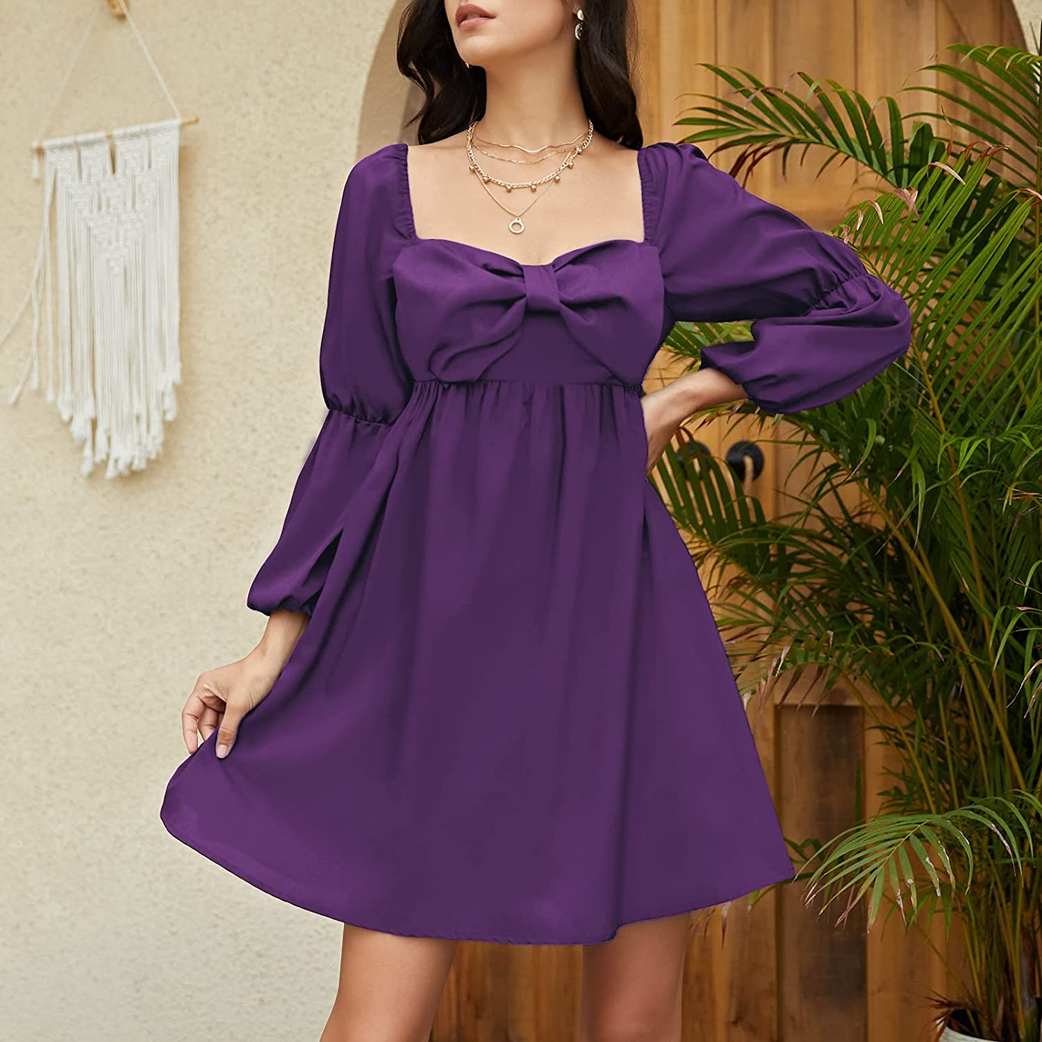 EXLURA Womens Summer Casual Wedding Guest Dress Square Bow Neck Long Puff Sleeve Dress Empire Waist Babydoll Mini Dress