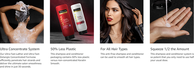 TRESemmé Ultra Keratin Smooth Concentrate System delivers salon-level smoothness and shine in 30 seconds and transforms frizzy hair. This shampoo and conditioner system delivers 2X more washes* and contains 2X the keratin smoothing actives per concentrated drop.