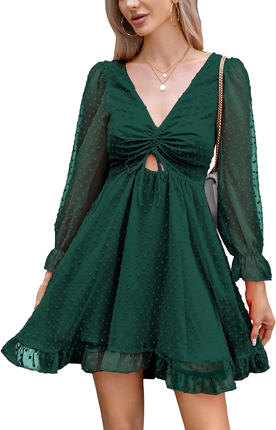 Design: v neck, puff long sleeve, ruffle cuff, drawstring, ruched front, cutout, smocked waistband, A line, frill hem, flowy swing dress, backless, tie back, Swiss dot, mini dress