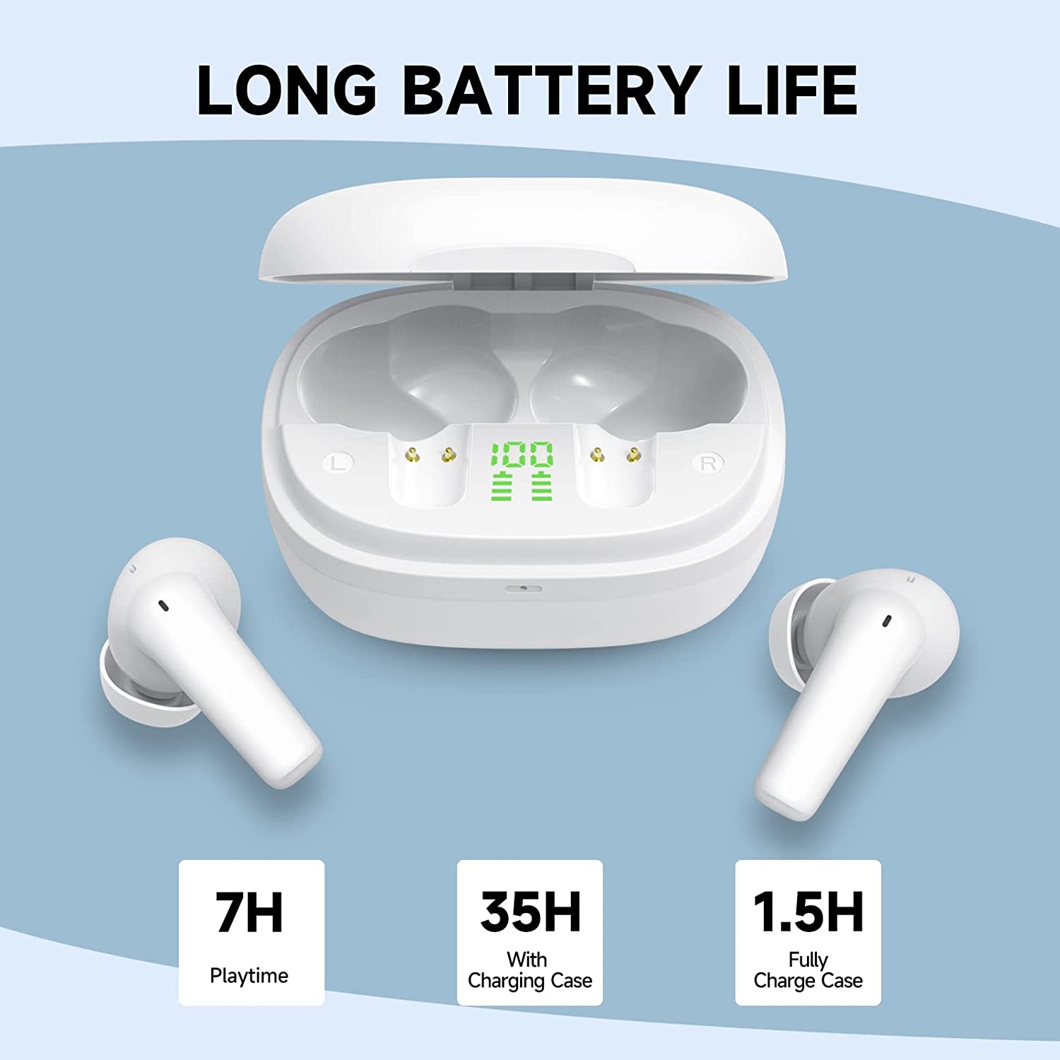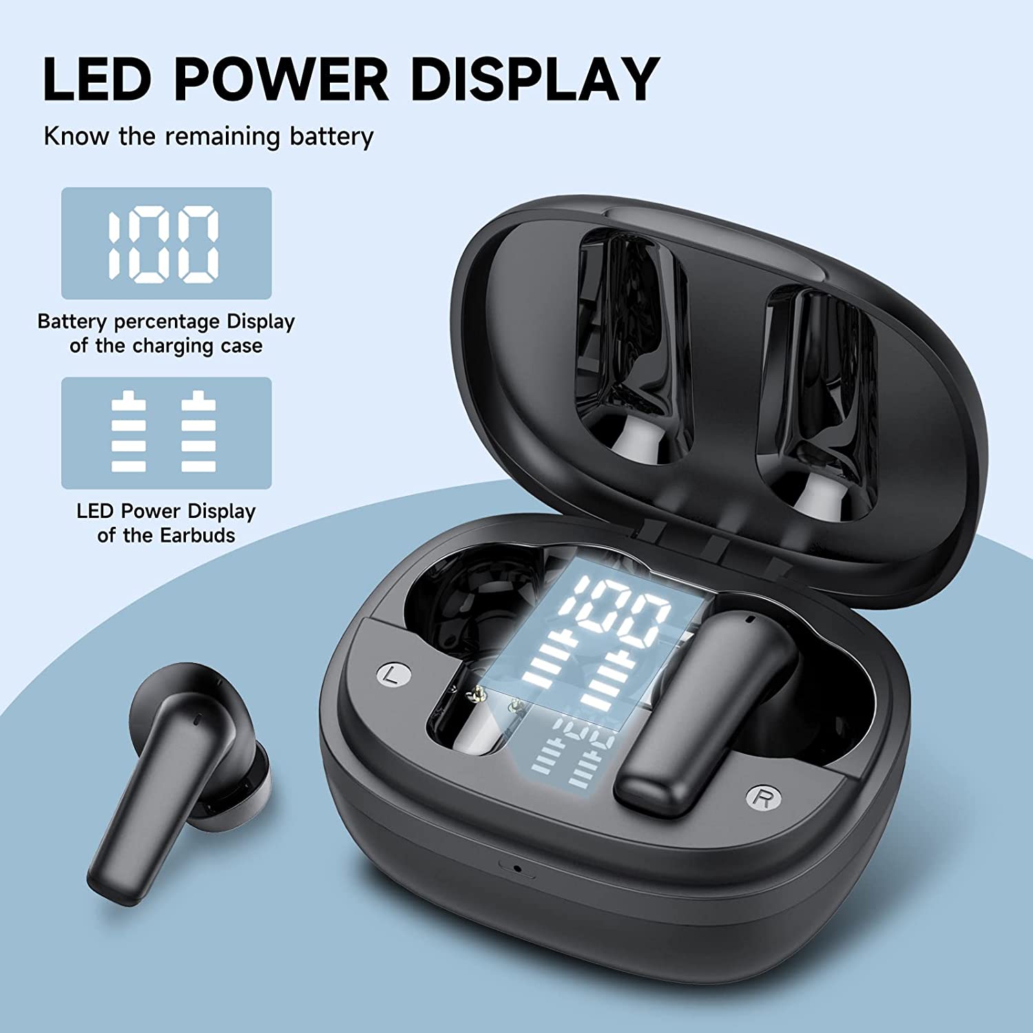 • Digital Battery Display: The bluetooth earbuds smart LED digital display feature shows the remaining battery power as a percentage of 1%-100%, showing you the battery life digitally, ensuring you have a clear view of the charge at all times.