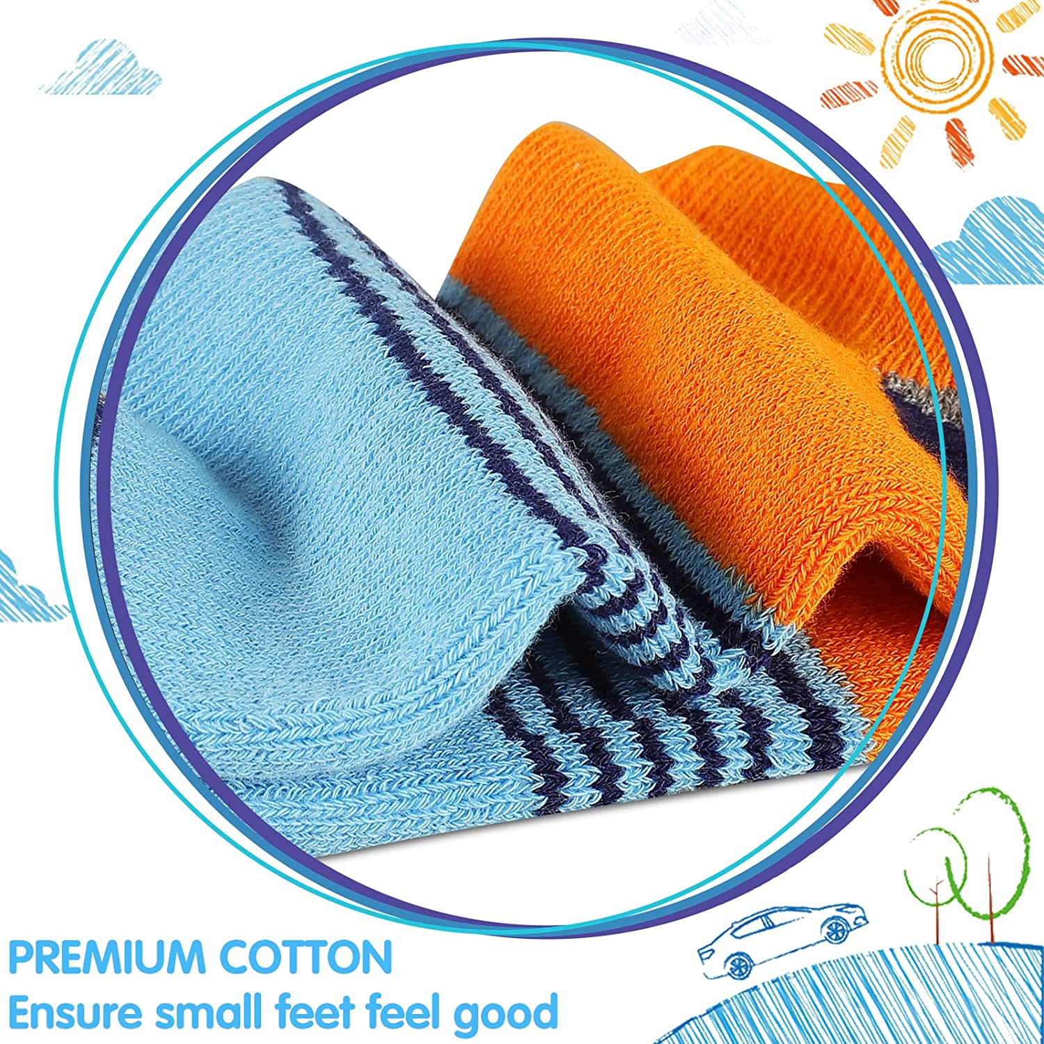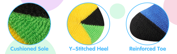 • Heel TAB: Our boys socks have a thicker and higher back around ankle that prevent rubbing against your kids’ delicate skin, also the tab gives a good place for him to pull his socks on.