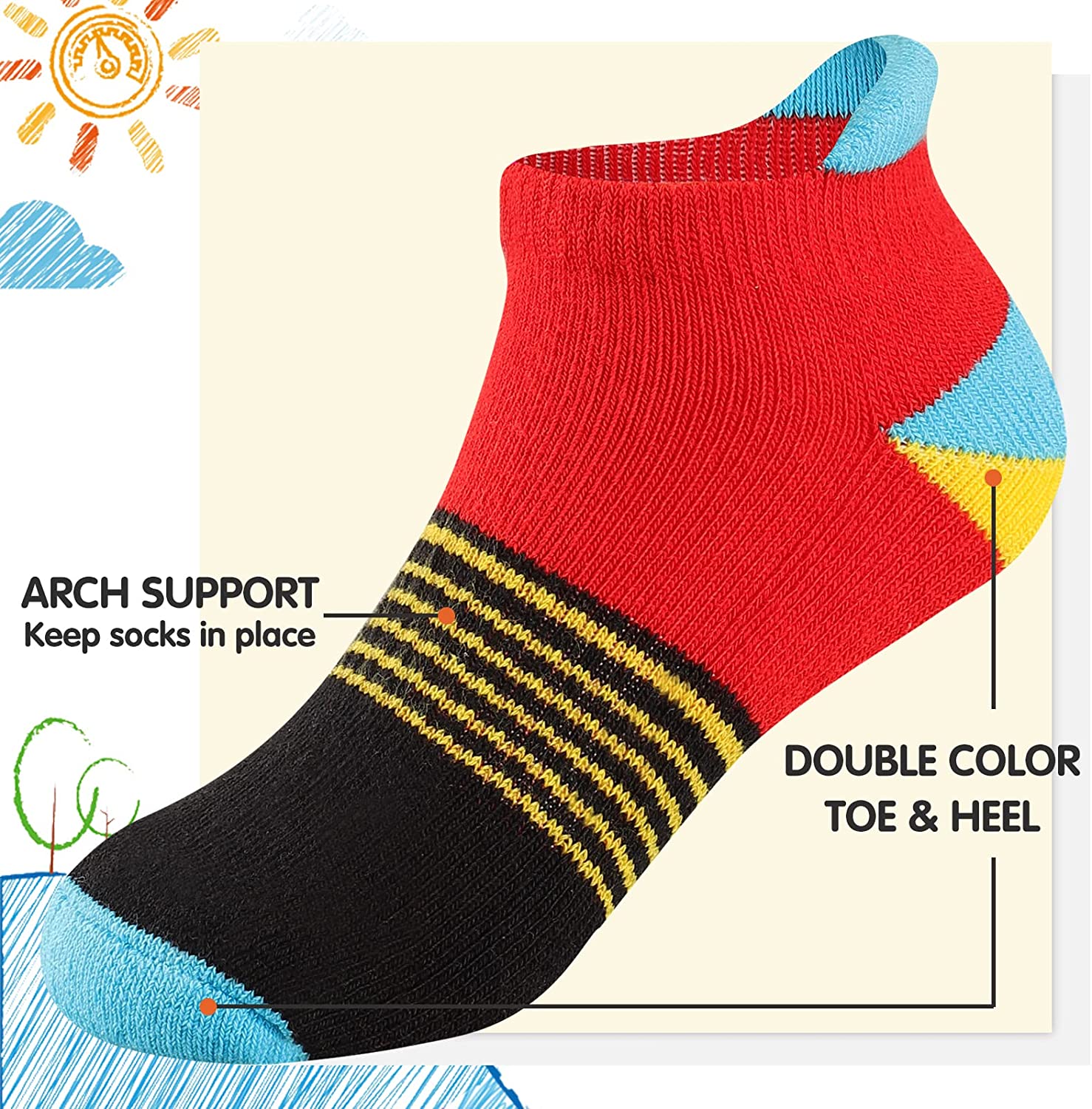 • ARCH SUPPORT & REINFORCEMENT: The kids short socks with arch band add support and stability, keeping socks in place and reducing foot fatigue. Reinforced toe and heel make socks last longer.