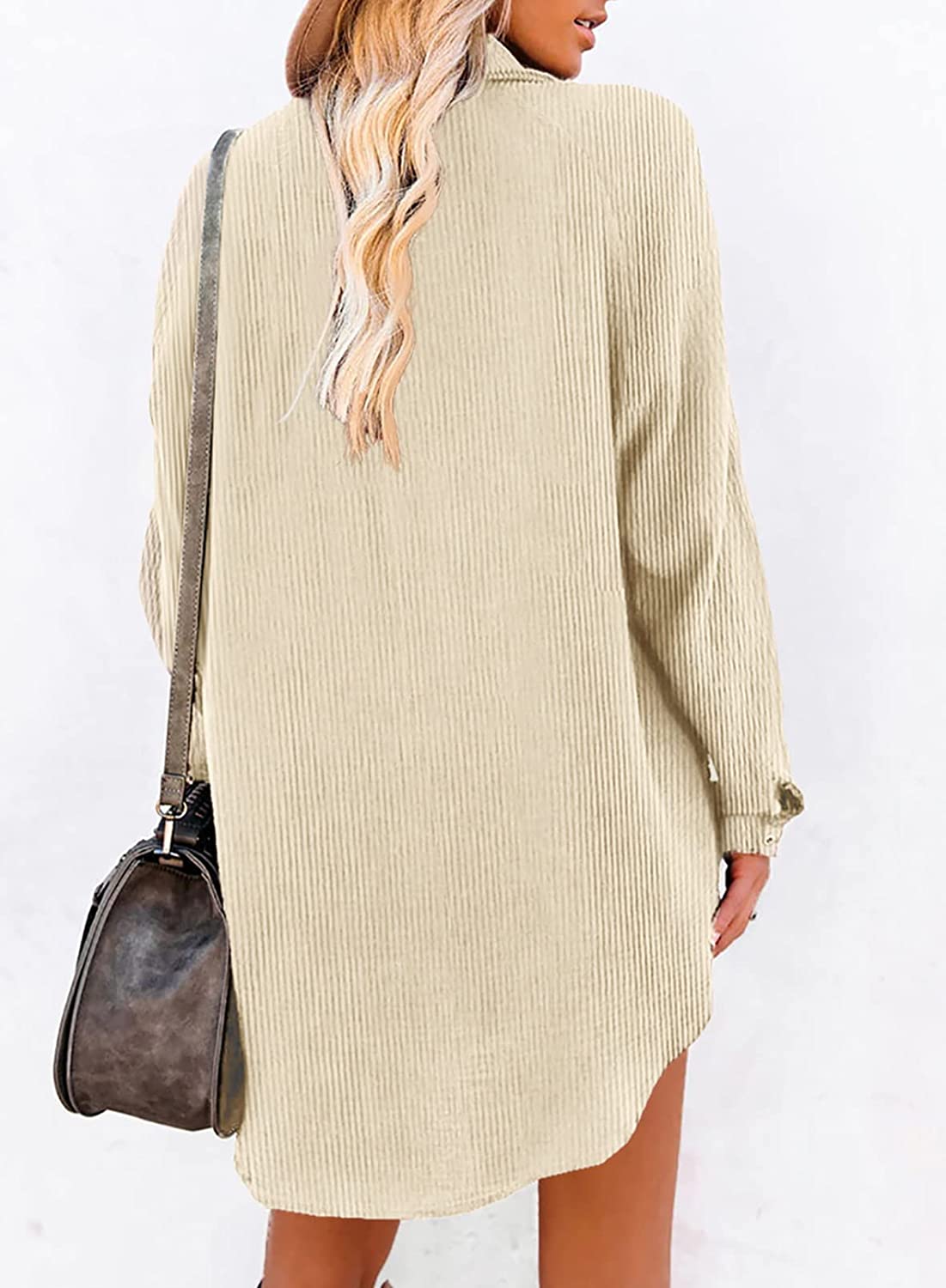 Fashion Design: Long Sleeve, Button, V Neck, Solid Color, Oversized Corduroy Shirt Dress.