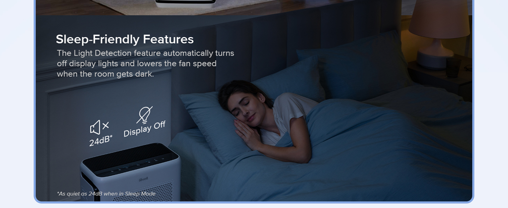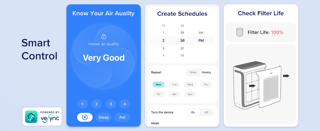 • CREATE SCHEDULES: Have a varied sleeping schedule? Schedule exact start and end times for the Vital 200S, selecting which fan speed or mode you’d like the air purifier to use at different time periods, such as Auto Mode or Sleep Mode