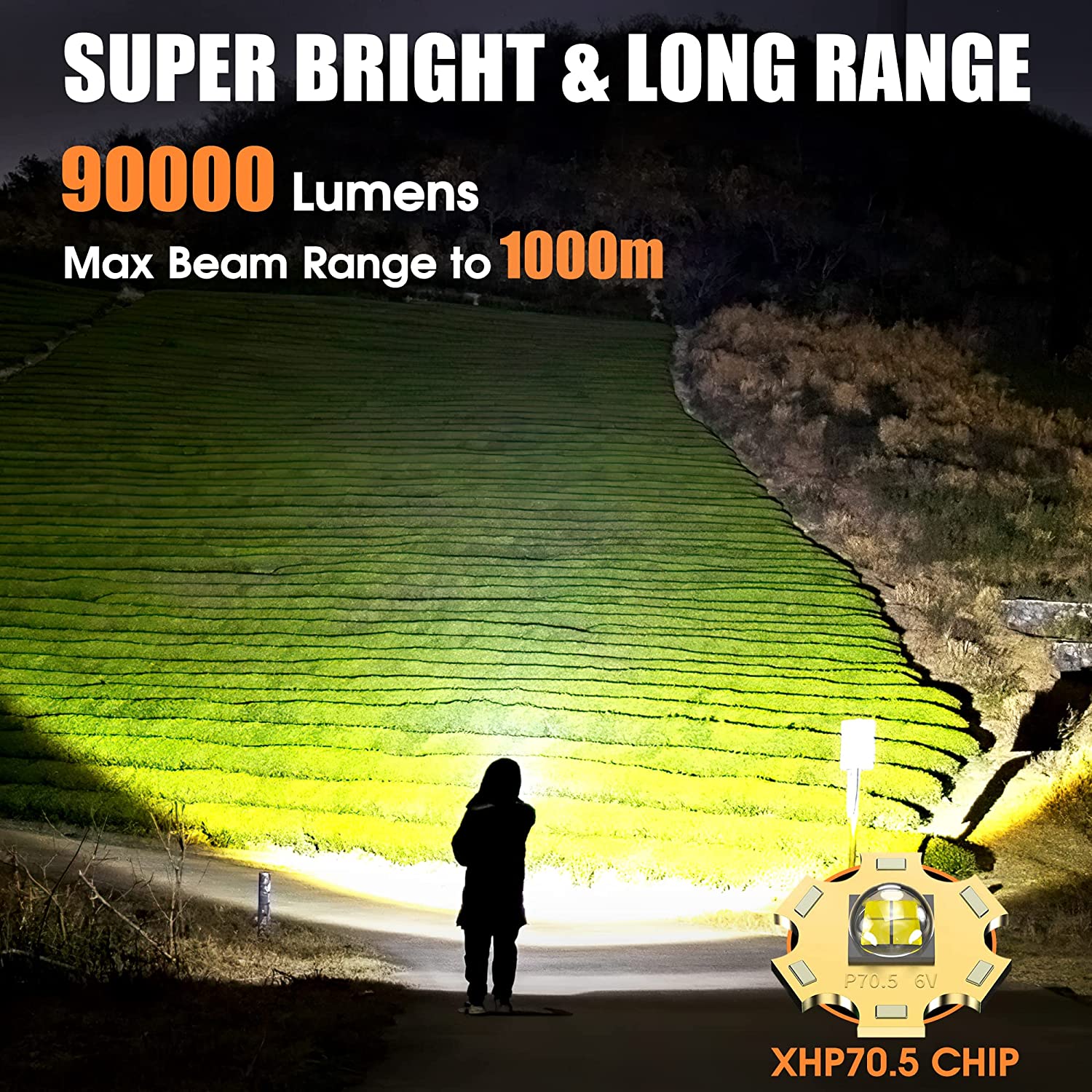 ?【SUPER BRIGHT RECHARGEABLE LED FLASHLIGHT】?MT100 high lumens flashlight uses upgraded XHP70.5 lamp beads, which can provide up to 150,000 lumens of brightness. The rechargeable led flashlight can reach a maximum irradiation distance of 3000 feet, or easily illuminate a wide area of 2000 square feet. The super bright flashlight allows you to easily see any strange things in the dark, so you no longer worry about the dark.
