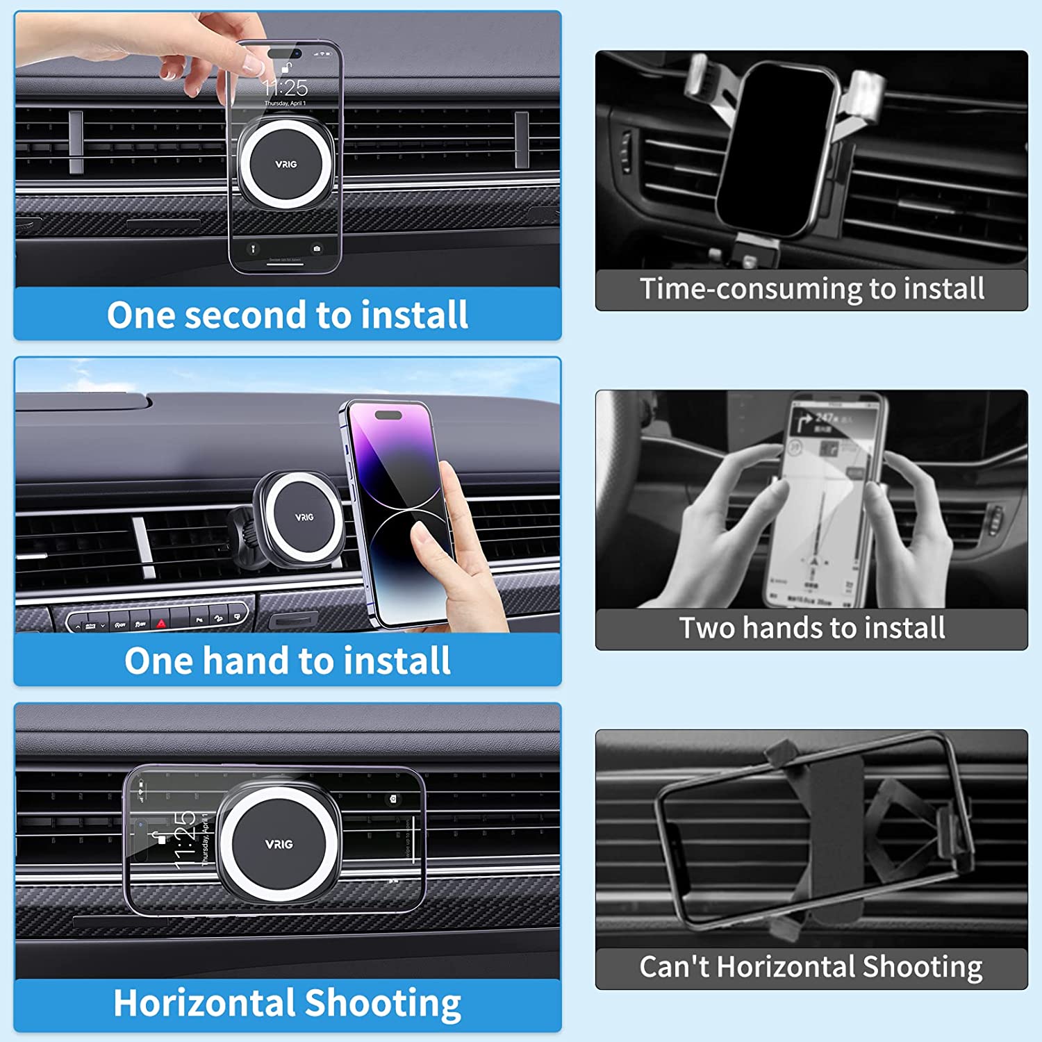 • ? Convincing quality and universal compatibility: VRIG car phone stand has passed magnetic force, telephone signal, hook stability and ingredient safety tests. The quality shall be strictly controlled. The car stand holds most smartphones and mini tablets compatible with iPhone 14 13 12 11 pro max/XR/X/8/7/6/5, Note 9/Galaxy Note20 U, S21 S20 S10 S9 S8 S7 S6, iPad Air 2/mini 3/pro 9.7 and more. This product can be used with MagSafe.