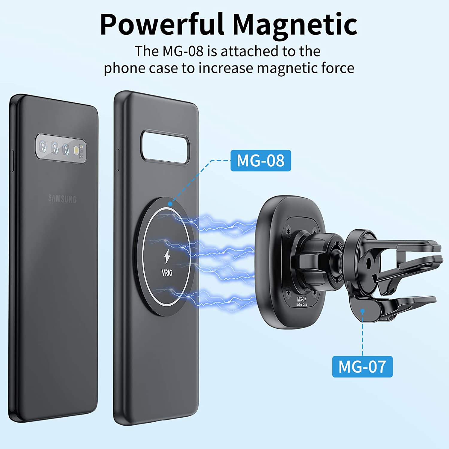 • ?LOCK YOUR PHONE FIRMLY: VRIG Magnetic Phone Car Mount with 6 built-in strong magnets, the maximum bearing up to weight of 4 cellphones. Powerful suction keep your cellphone stay stably even when drive on a bumpy road. PLEASE NOTE:1. It is recommend that use the “VRIG round pad” on the back of your phone/case. It is more stable than the square. 2. “VRIG round pad”,Applicable to all mobile phones, super powerful, making mobile phones more stable
