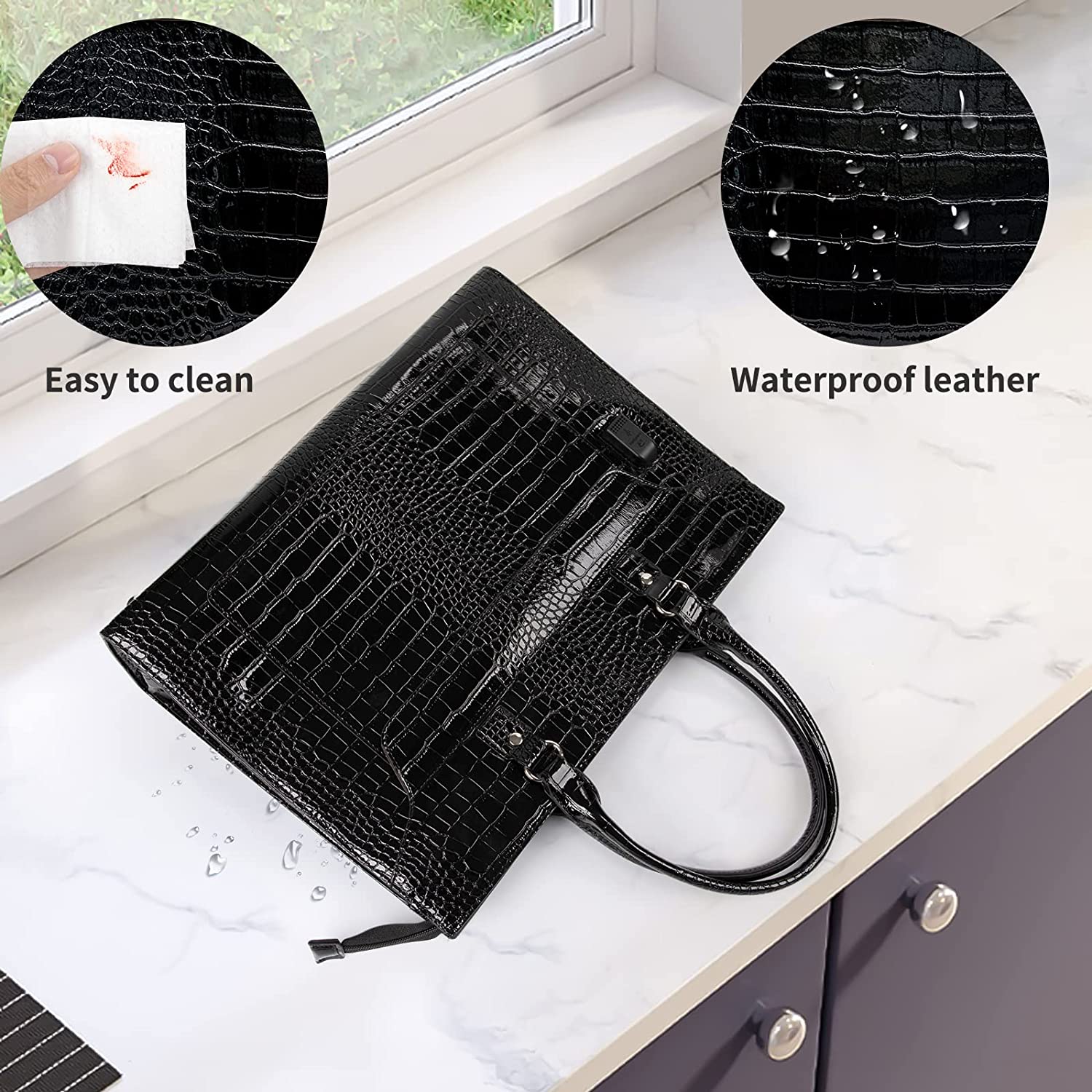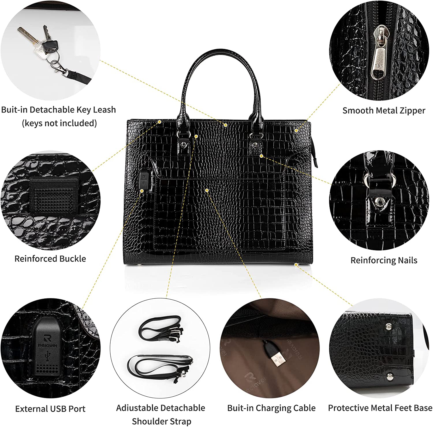 • 【High Quality Material】: Fashion waterproof black leather, the polished silvertone hardware,easy to clean, wear-resistant and anti-wrinkle make this womens laptop bag last longer. Top zipper closure. In addition, metal feet base protects this laptop briefcase from damage.