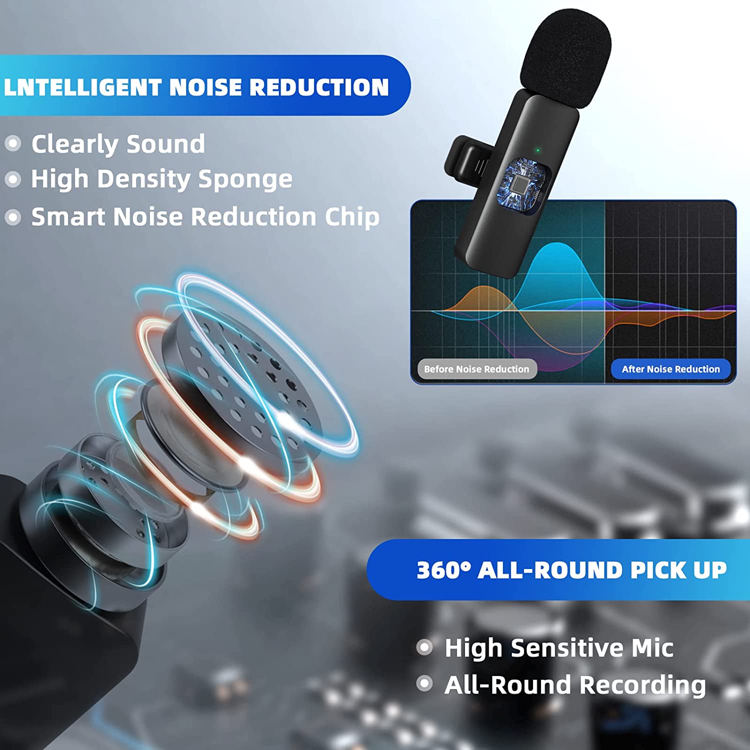 Low Delay & Noise Reduction: The wireless Lavalier microphone Uses real-time auto-sync technology, 2.4G signal transmission super low latency(0.009s); the sound picking-up follows the picture in real-time and will not be misplaced. Built-in noise reduction chip, get crystal clear audio. The lapel microphone suitable for Android and iPhone can effectively recognize the raw sound and clear recording in noisy environments