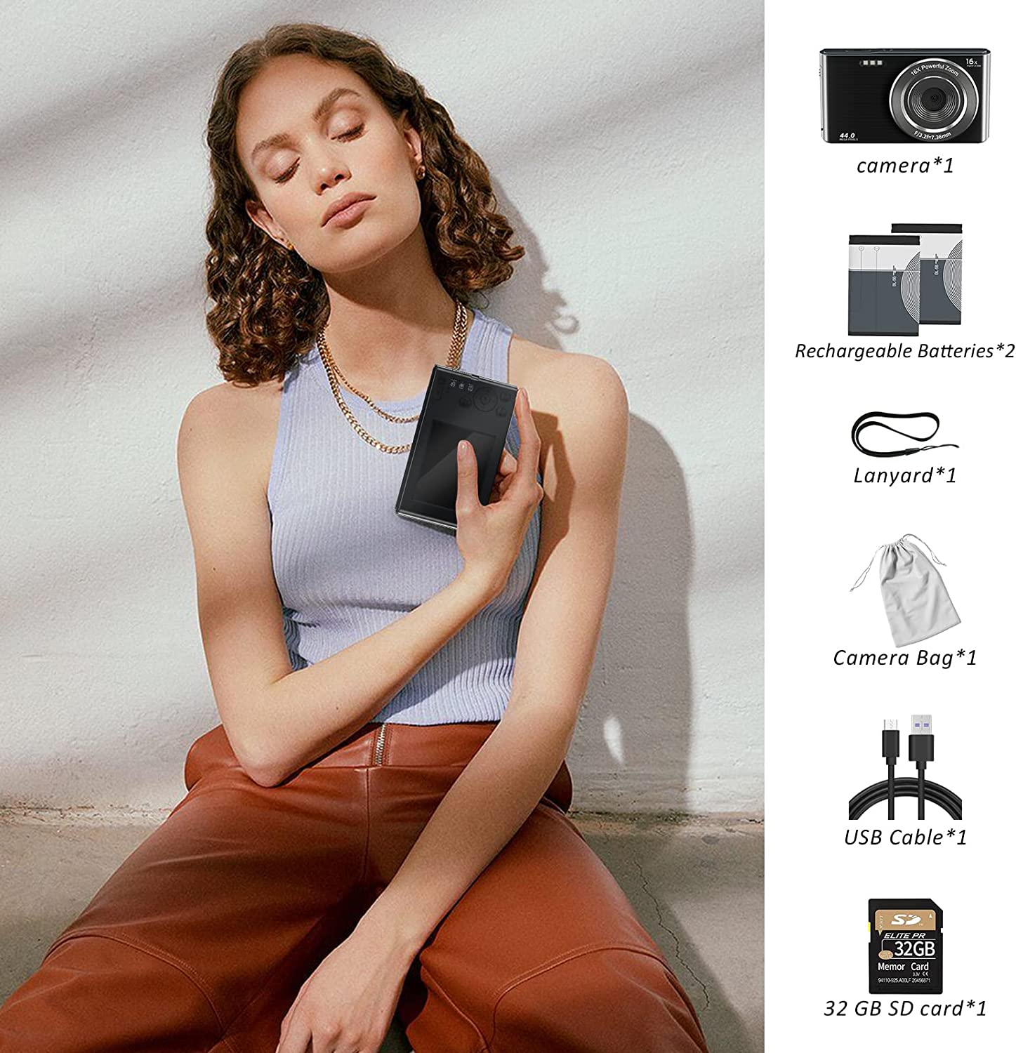 • 【4K & 44MP Digital Camera for Photography】NIKICAM 4k compact photography camera for kids girls boys adults has 4k video resolution and 44MP image resolution, and support 16X digital zoom, helping you capture and record the most exciting memorable moments with high-quality images or videos. This rechargeable digital camera come with a 32GB SD card, just turn the camera on and record the exciting moments wiht your family now!