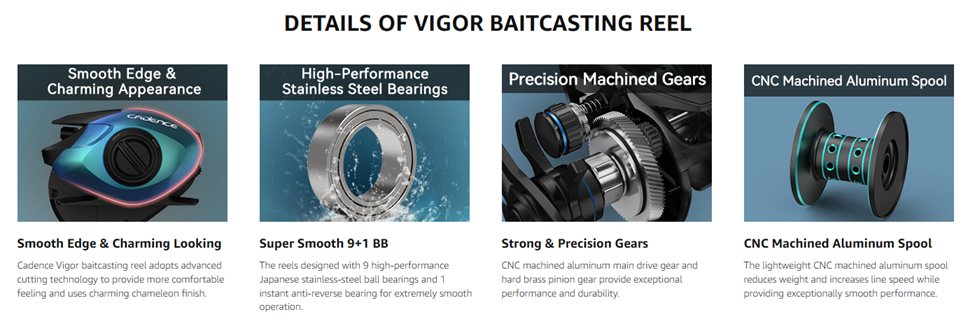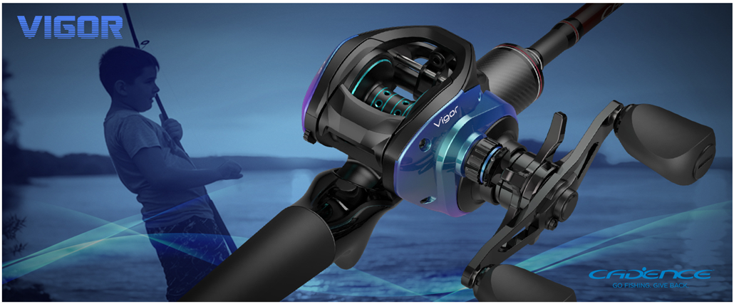 • Comfortable Palm Compact Design - Cadence Vigor baitcaster reel features an ergonomic compact design with cool chameleon finish. At only 6.7oz, it is constructed with extremely durable light weight carbon fiber frame and side plates, built-in high strength brass pinion gear and 7075 aero-space aluminum drive gear (80% lighter than brass!) which provides you comfortable reel feel and reduces your fatigue for all day comfortable fun fishing!