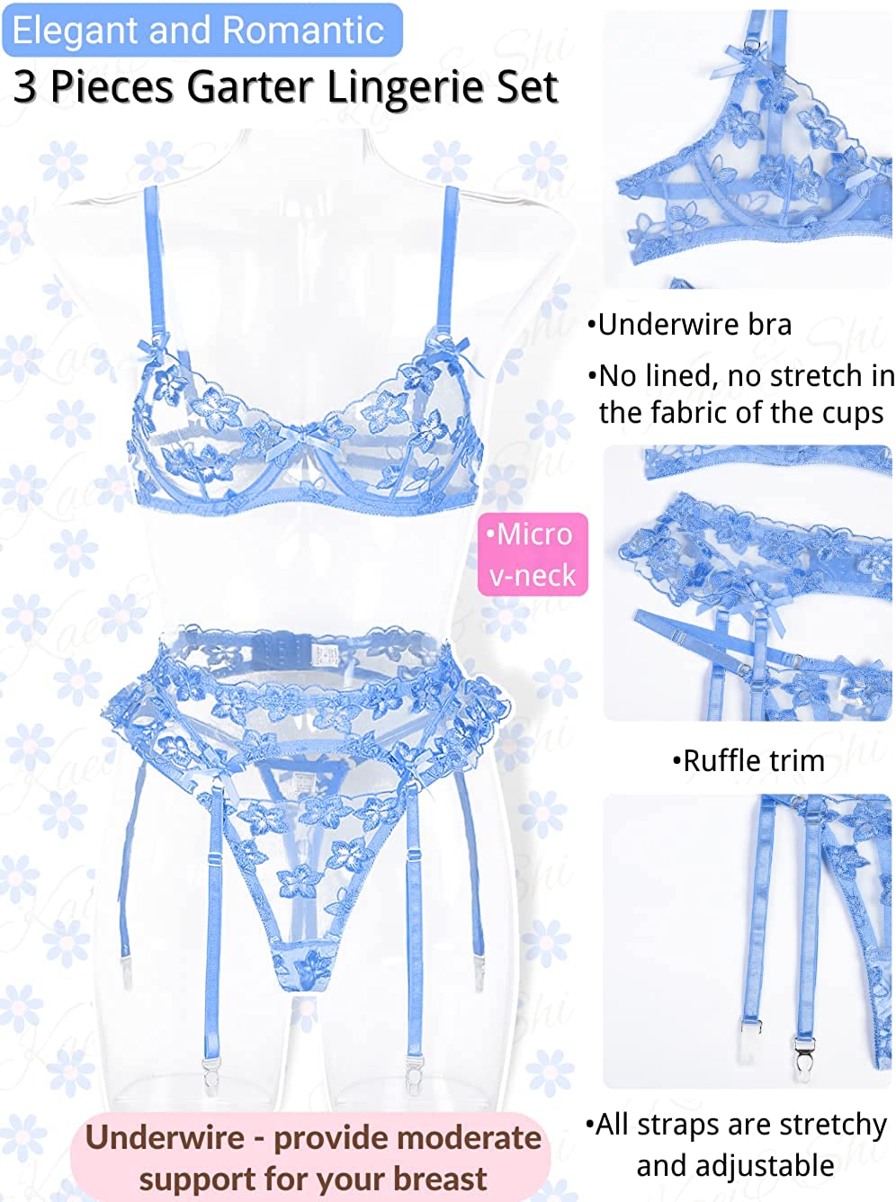 ✿Style: This underwire ruffle lingerie set with flower embroidered lace overlay and satin bow decor can enhance femininity and outline sexy breast lines.