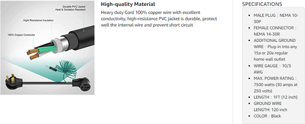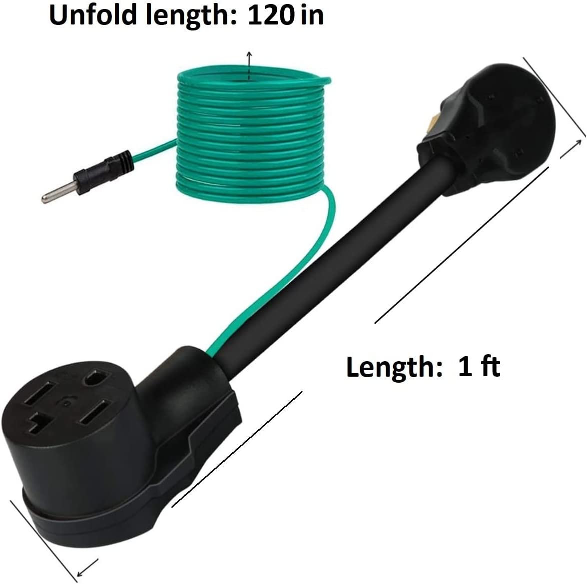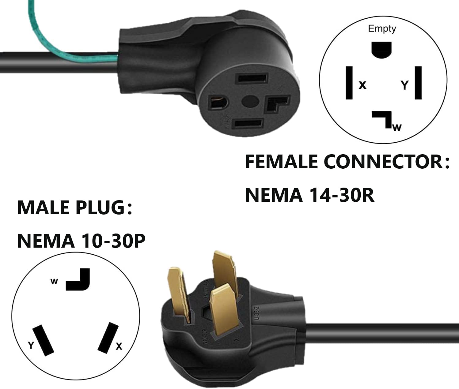 • Product Specification: NEMA 10-30P 3-prong plug 125V/250V molded male. NEMA 14-30R 4-prong socket 250V molded female connector. Both are right angle, 30 AMP, Max wattage 7500 watts, 1FT