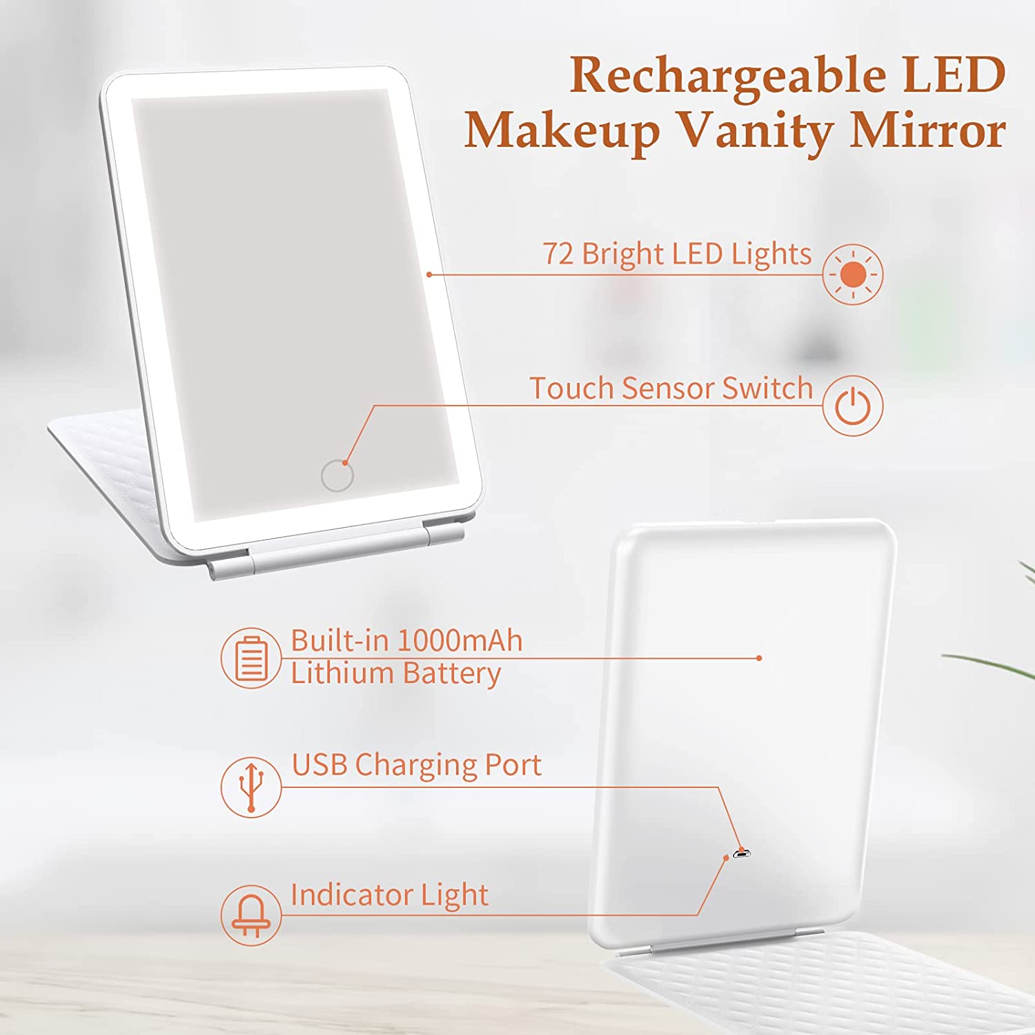 Zelaxy Rechargeable Travel Makeup Vanity Mirror with 72 LED Lights, Portable Lighted Makeup Mirror with 3 Color Lighting, Touch Sensor Dimming, Foldable Tabletop Light Up Cosmetic Beauty Mirror