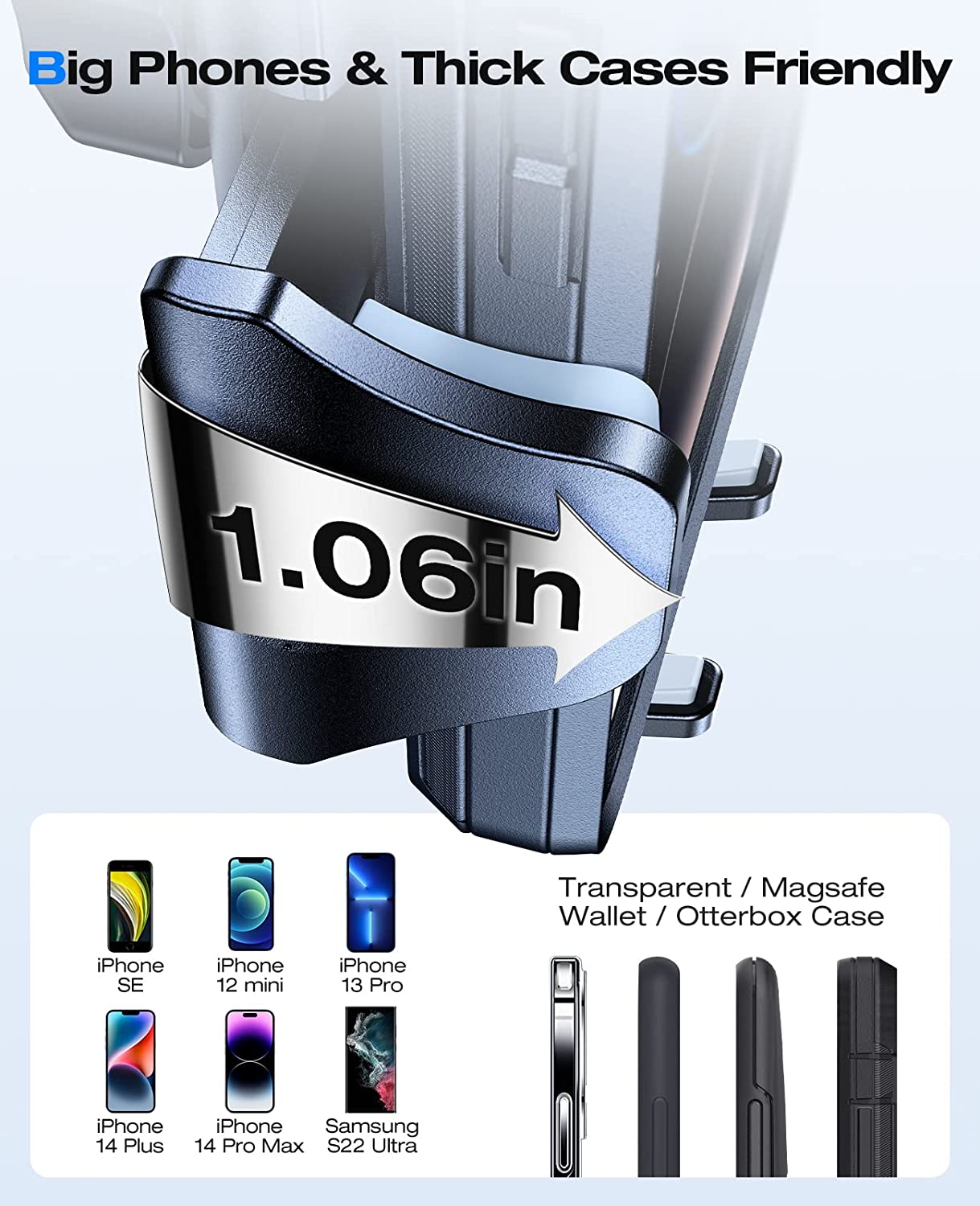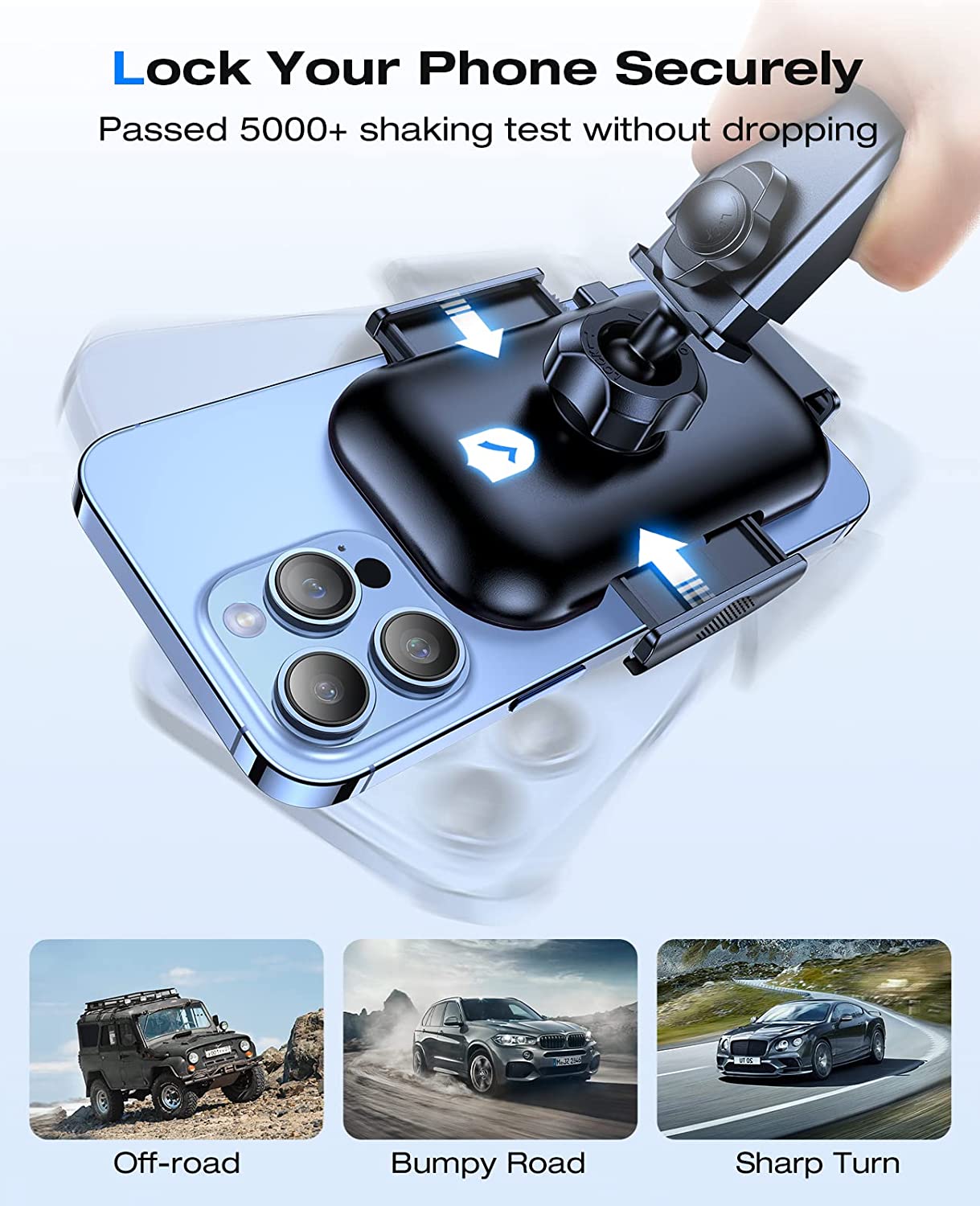 [Ultimate Protection for Your Phone] This cell phone holder car features upgraded 3rd gen scratch-free twill silicone panel and stronger clip arm. Unlike the rough plastic panels on the market, our soft twill silicone panels won't scratch your phone or case. Not only that, the clip arm has also survived 55-pound weight-bearing tests and 5,000+ shake tests with ZERO looseness. Even on bumpiest roads, sharp turns, gravel roads, no worrying about falling from the car phone mount and distracting you