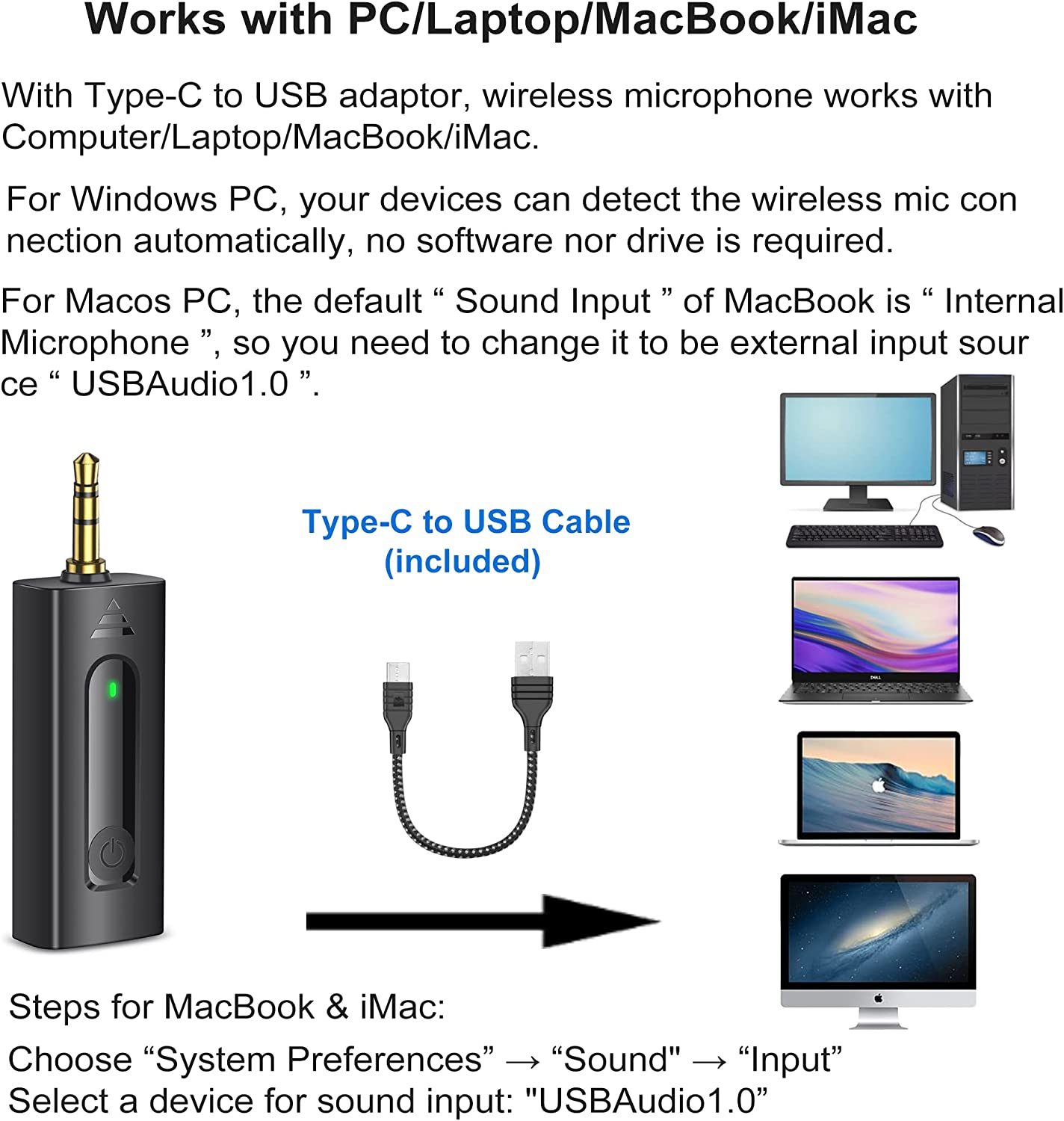 ✅【Wide COMPATIBILITY】Upgraded external wireless lav mic comes with a 3.5mm TRS receiver, a type-c to IOS cable, a type-c to Android cable, a type-c to USB cable. Which supports most smart devices includes: iPhone, iPad, Androind Phone, DSLR camera, Laptop, MacBook, iMac, GoPro and Camcorder. (Please note: The receiver has 3.5mm TRS jack, it doesn’t work with 3.5mm TRRS devices)