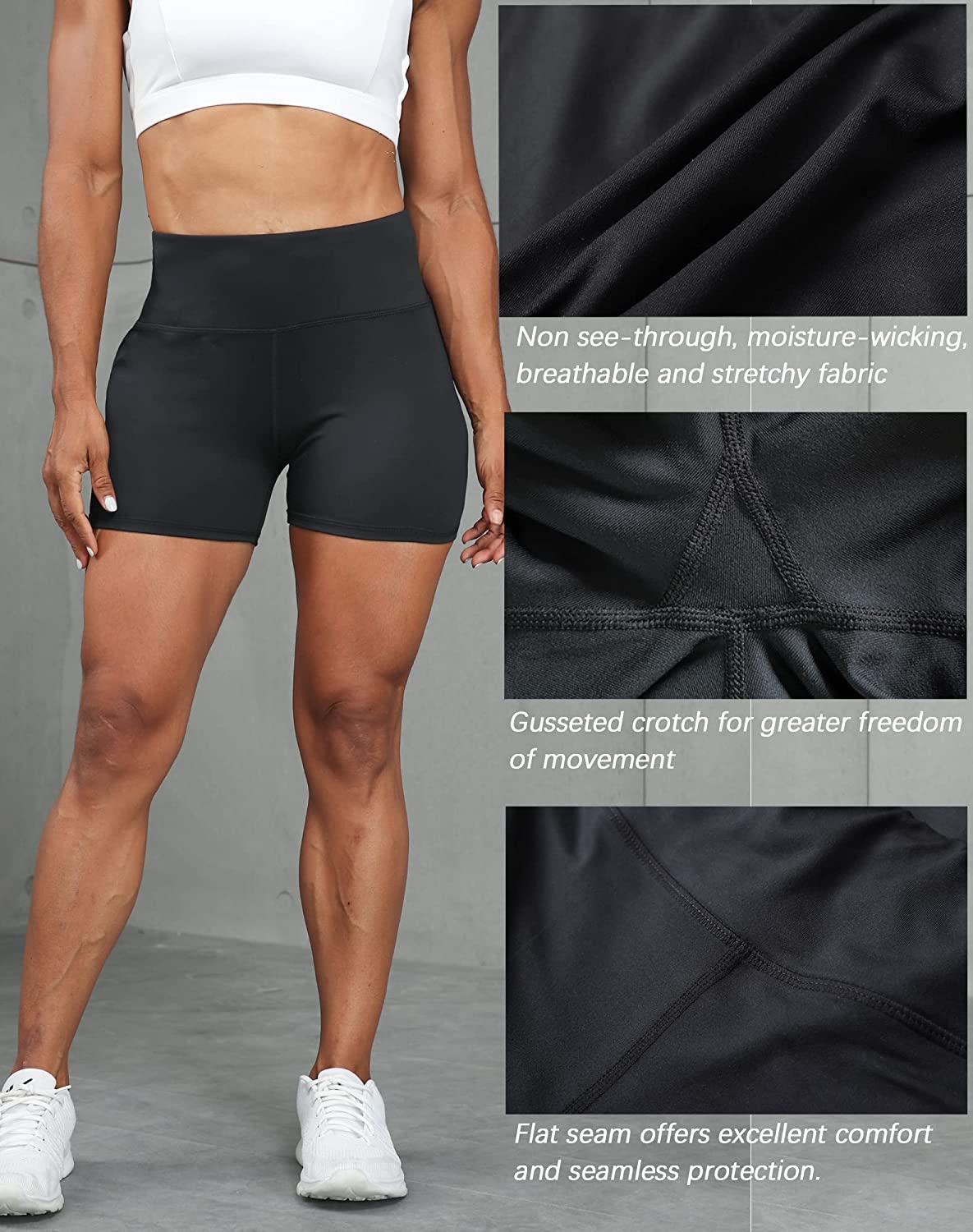 Gusseted crotch design and elastic waistband: These biker shorts are designed with a gusseted crotch that reduces chafing and allows for a full range of motion. The high-rise waistband and tummy control offer a secure and flattering fit, helping you feel confident and comfortable during any exercise